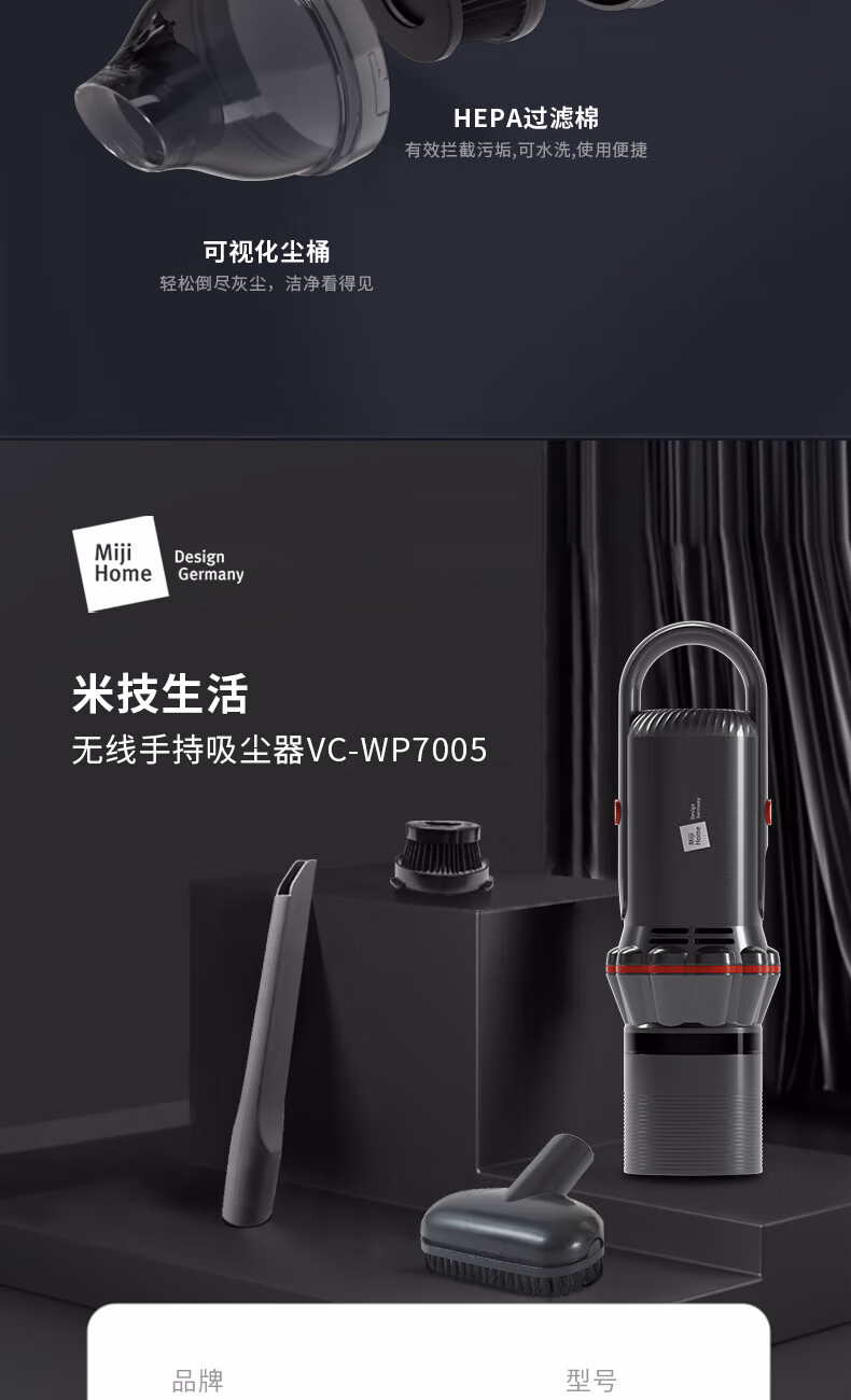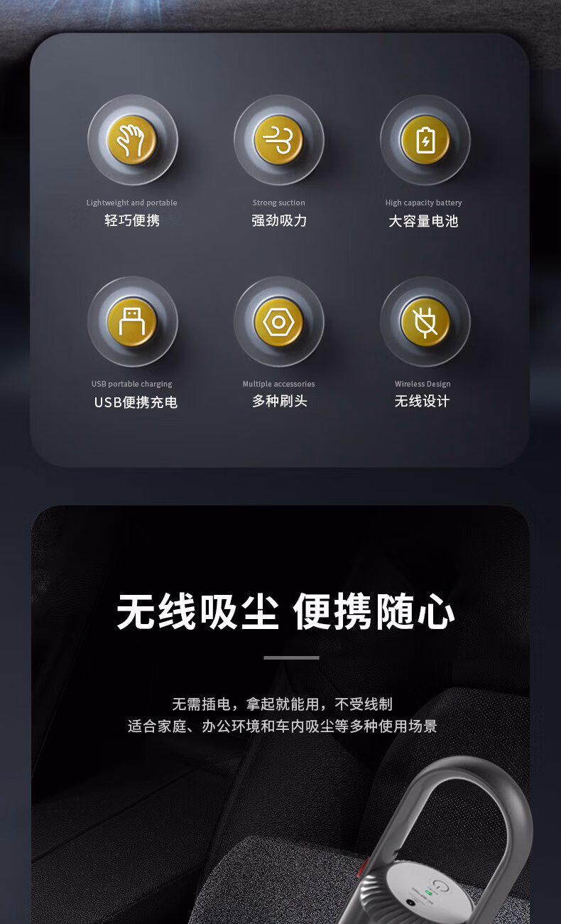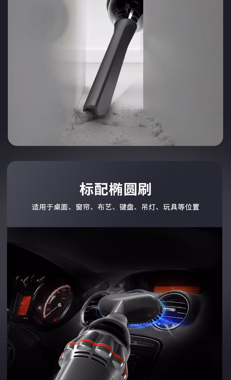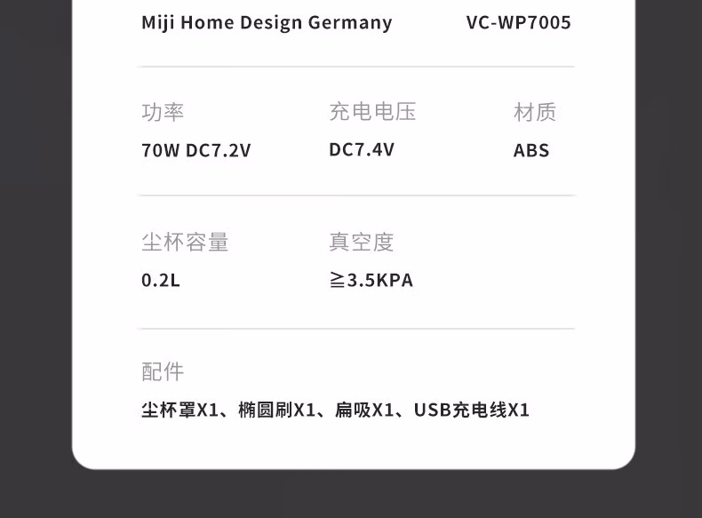 配件:尘杯罩x1、椭圆刷x1、扁吸x1、USB充电线x1