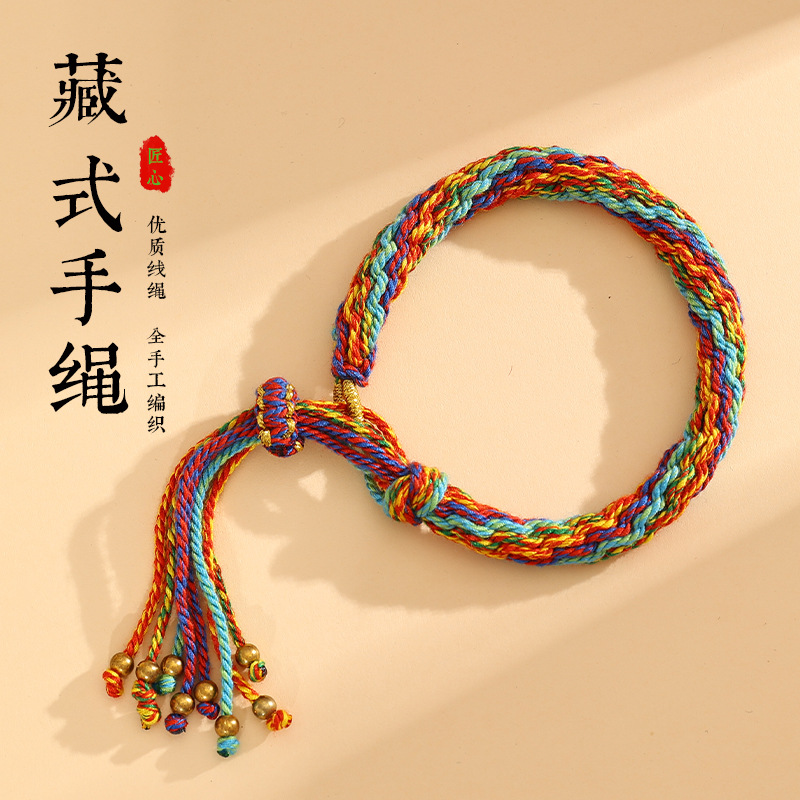 藏式轮回手绳手工编织民族风五彩绳手链可挂唐卡手搓棉线手绳批发