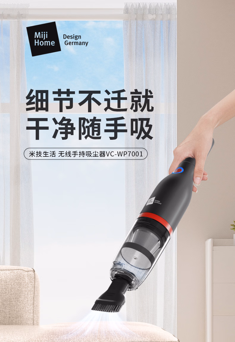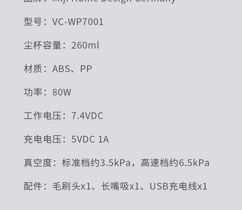 产地: 中国制 型号: VC-WP7001 尘杯容量: 260ml 材质: ABS、PP 功率: 80W 电压: 7.4VDC 电池容量: 2000mAh 充电:: 5VDC 2A 真空度:: 标准档约3.5kPa高速档约6.5kPa 配件: 毛刷头x1长嘴吸x1 Type-C充电线