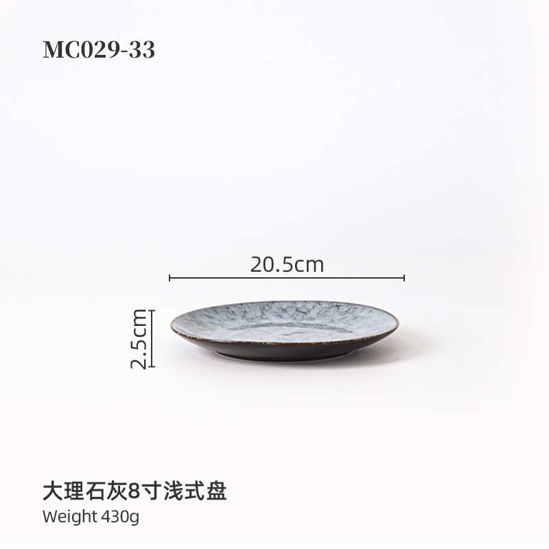 品牌: 名驰陶瓷 货号: 8寸浅盘 产品类别: 窑变 材质: 瓷 是否进口: 否 适用人群: 通用 图案: 纯色 风格: 现代简约 形状: 圆形 微波炉: 可用
