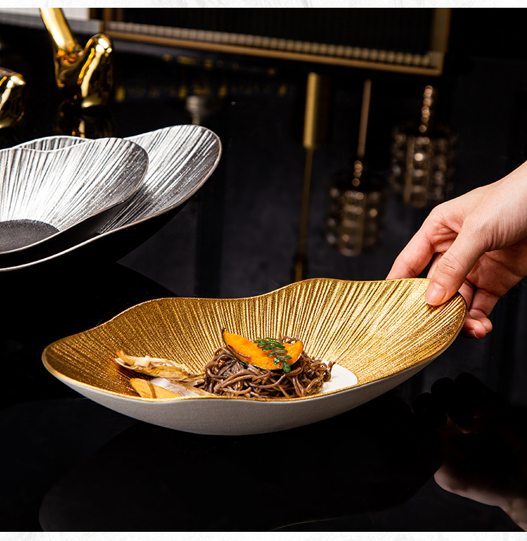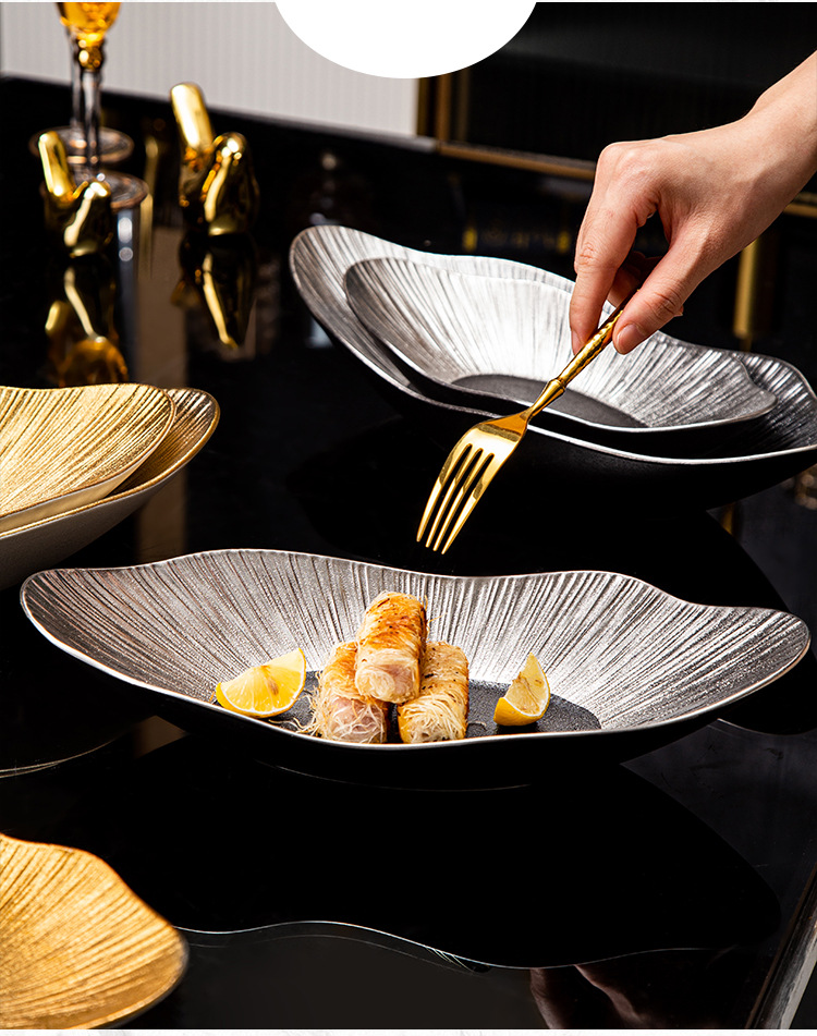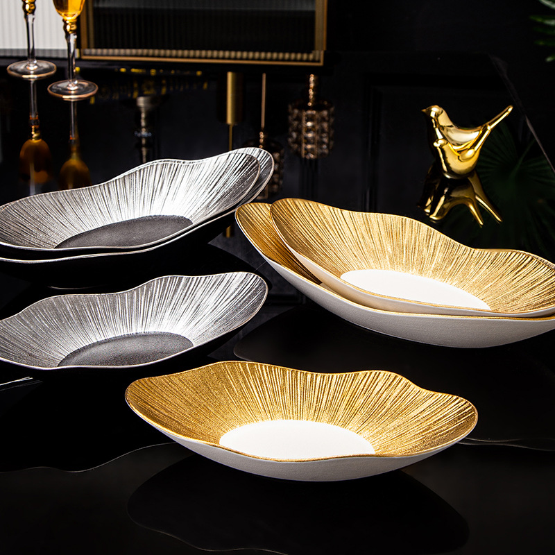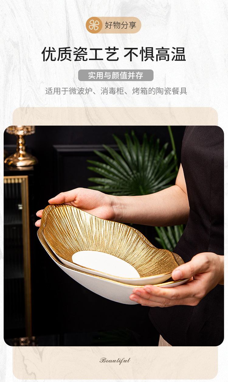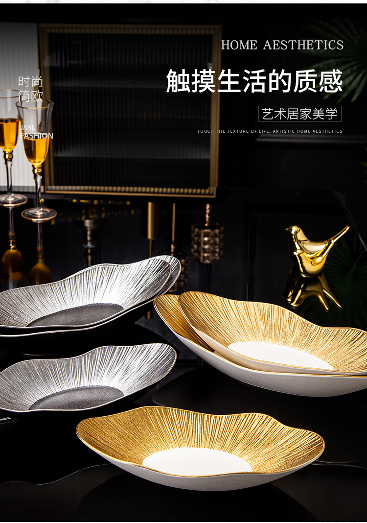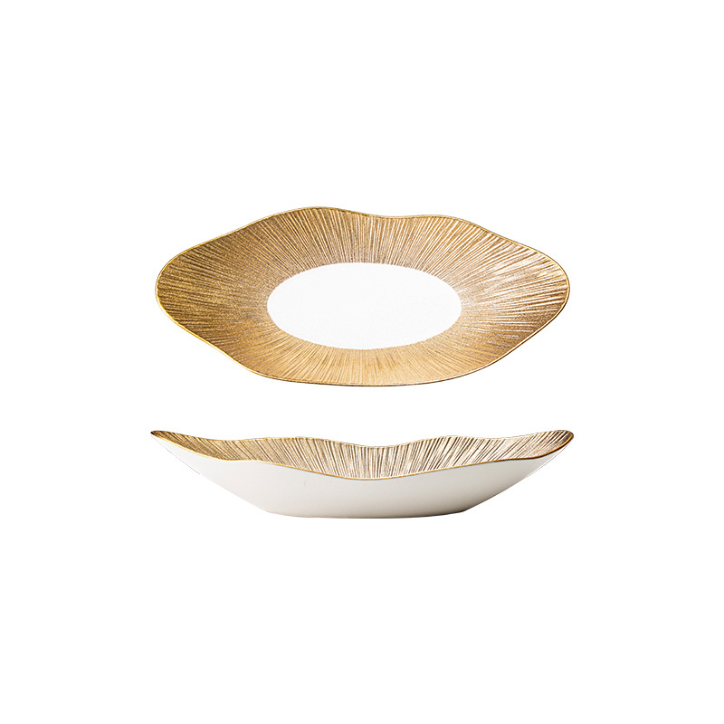 品牌: 通隆 货号: SWDD-005 产品类别: 盘 材质: 瓷 是否进口: 否 适用人群: 通用 图案: 条纹 风格: 轻奢风 形状: 不规则形 微波炉: 可用