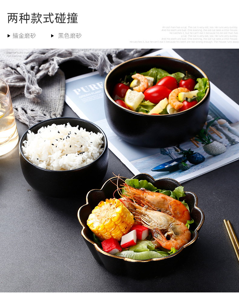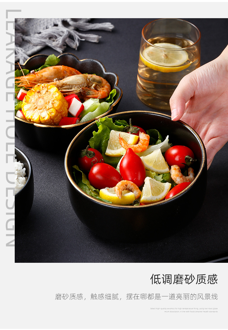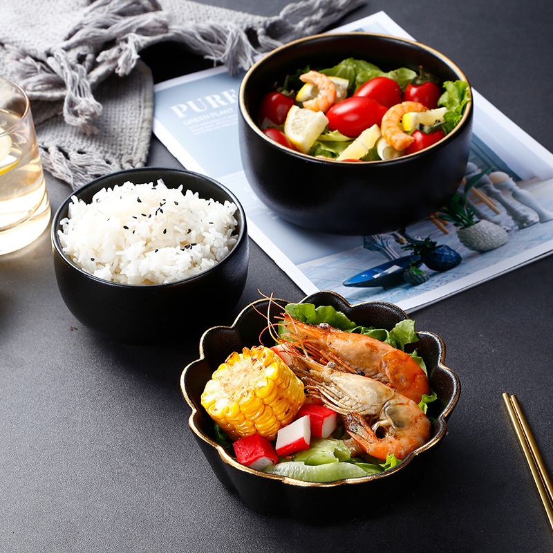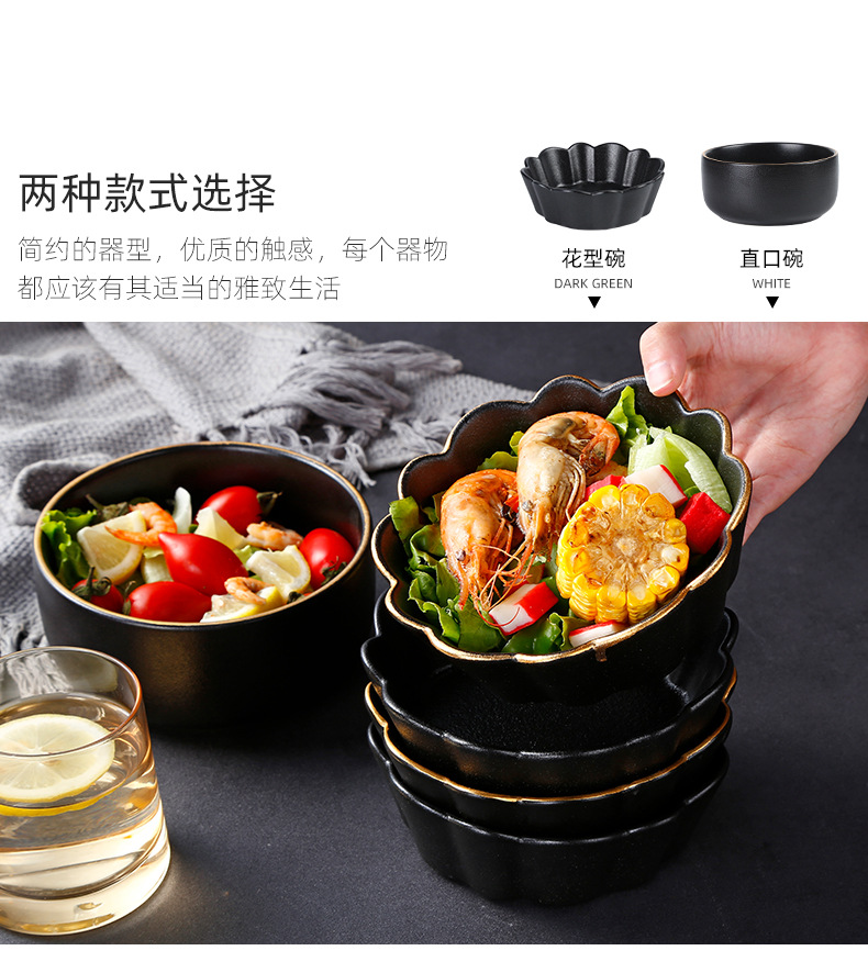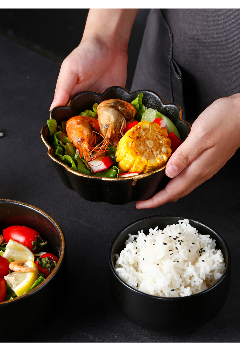 创意磨砂黑色釉陶瓷花型碗餐厅家用饭碗面碗水果沙拉碗带金边烤箱 English | 投诉