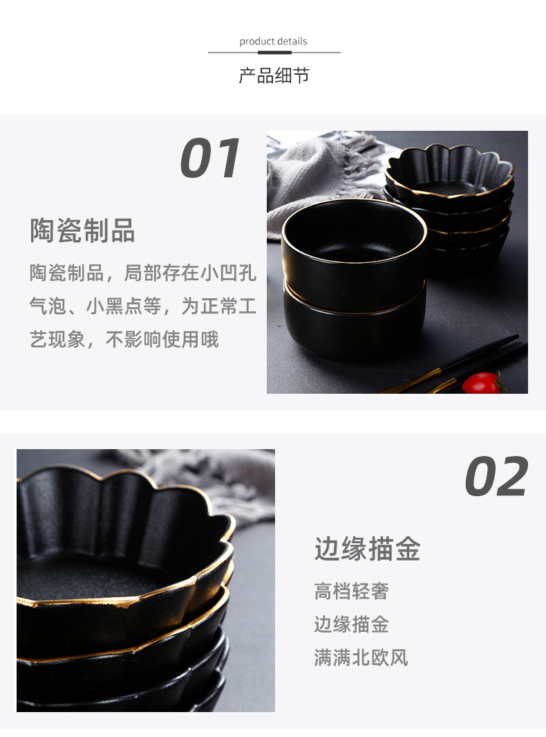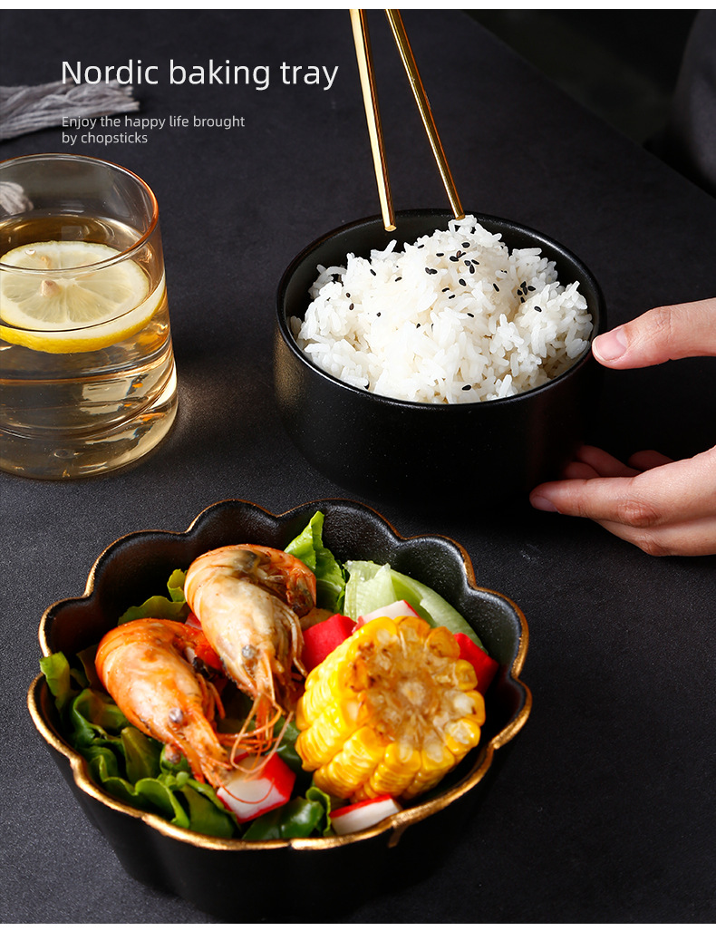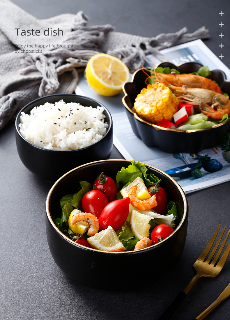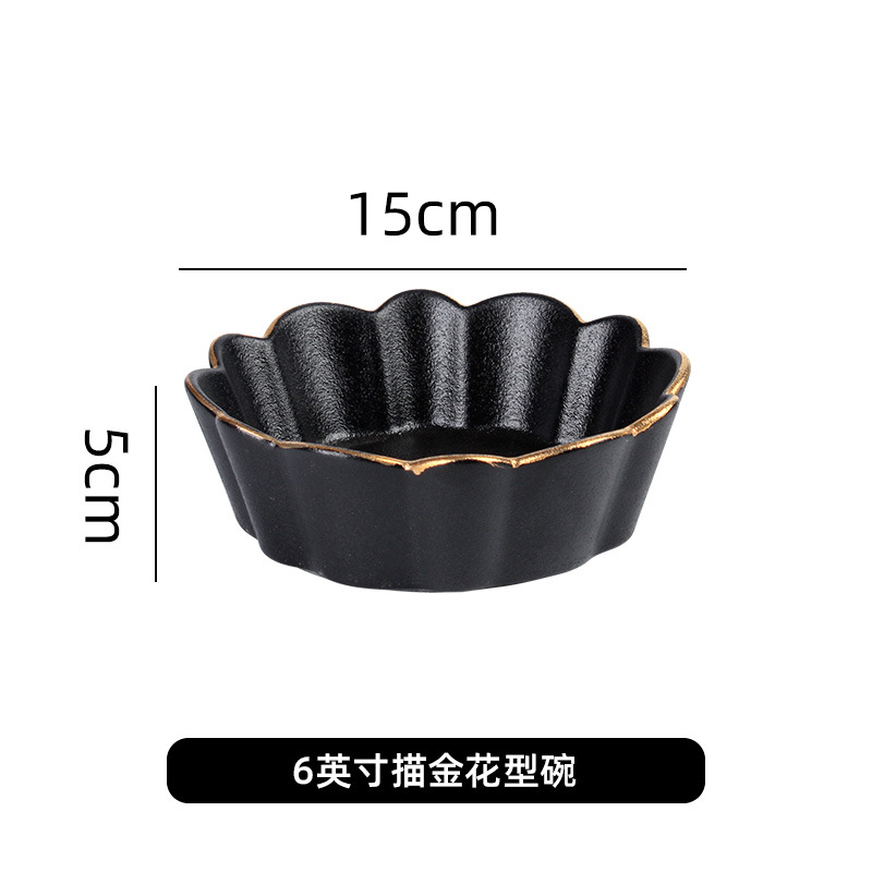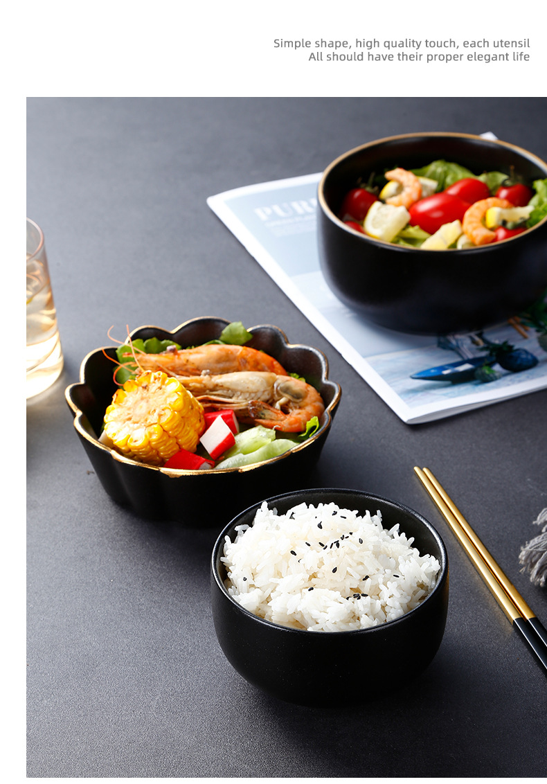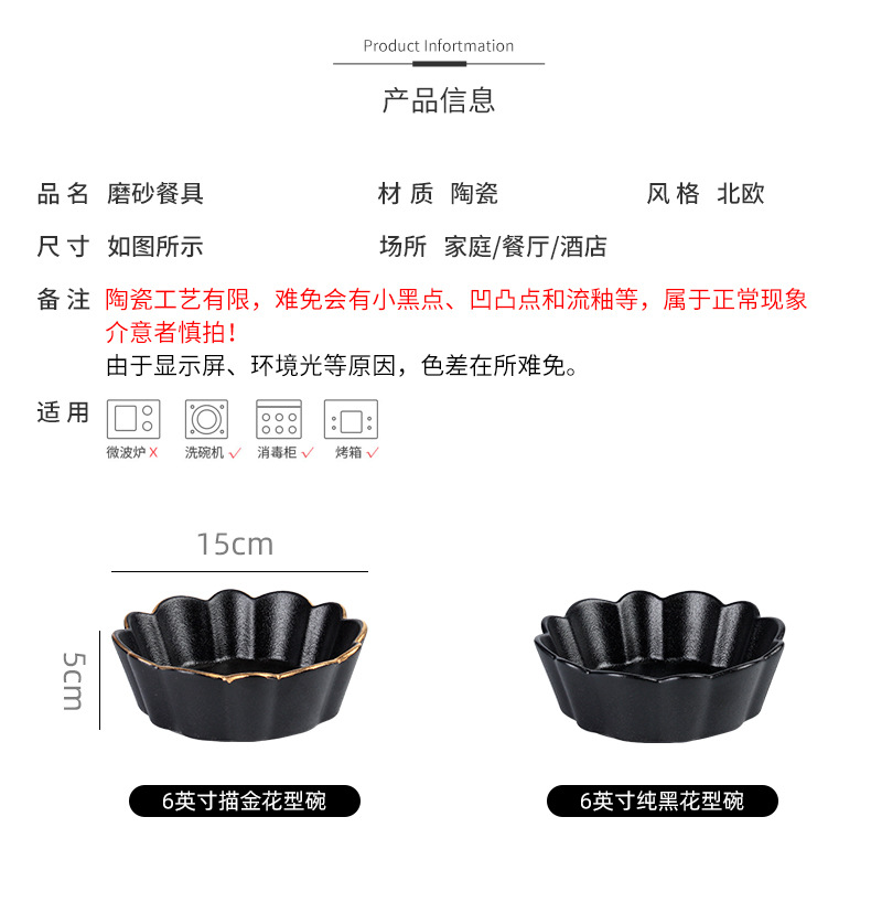 创意磨砂黑色釉陶瓷花型碗餐厅家用饭碗面碗水果沙拉碗带金边烤箱 English | 投诉