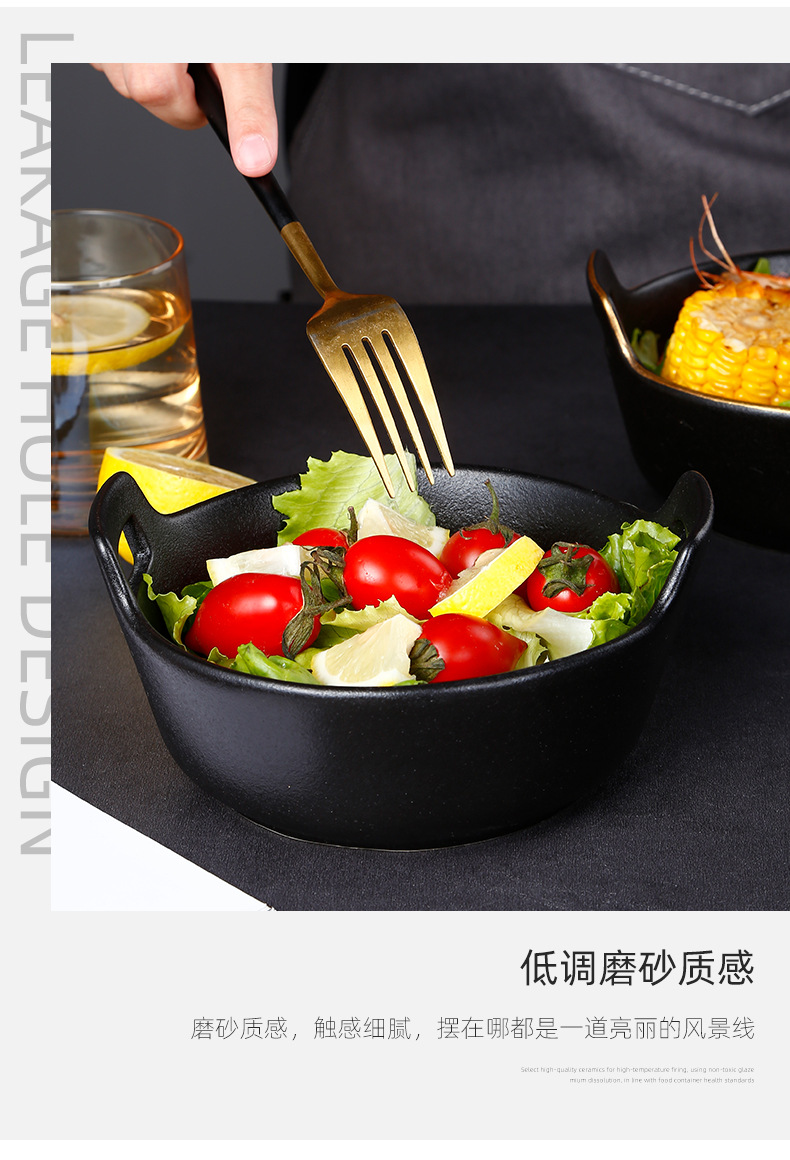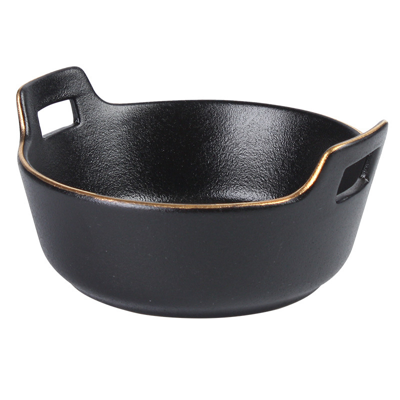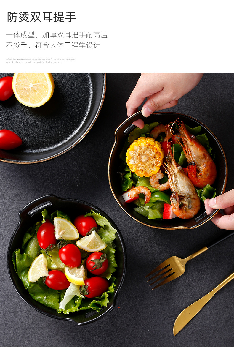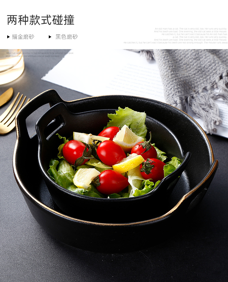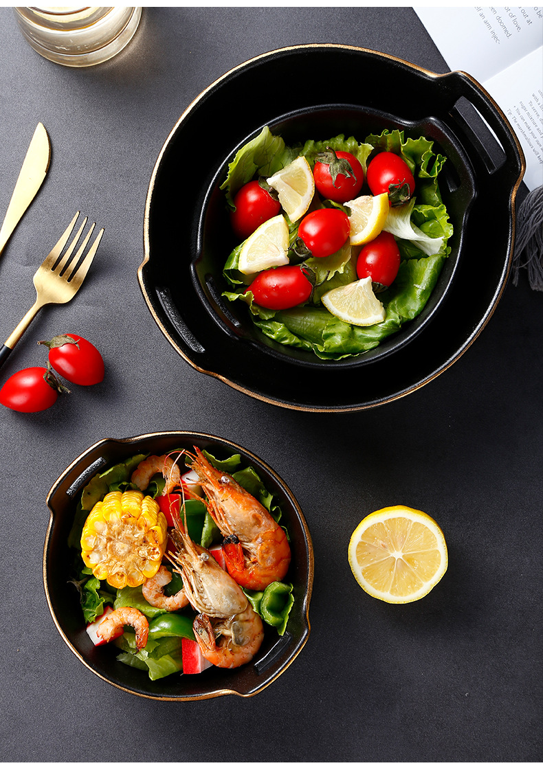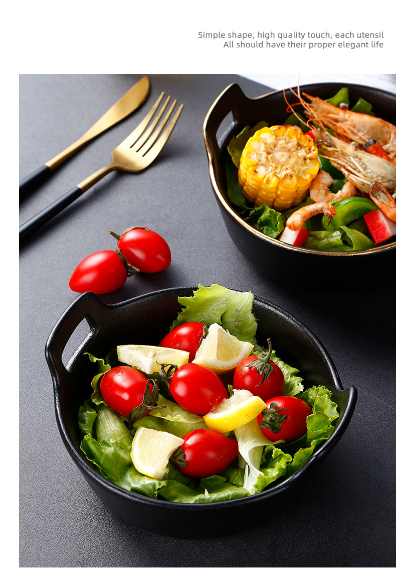 磨砂黑色釉陶瓷双耳碗创意餐厅家用带金边餐具沙拉碗烤箱洗碗机 English | 投诉