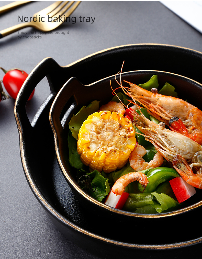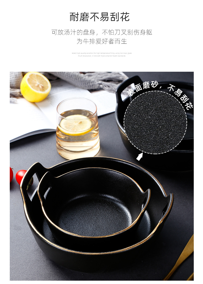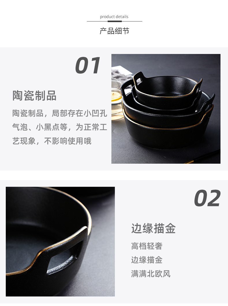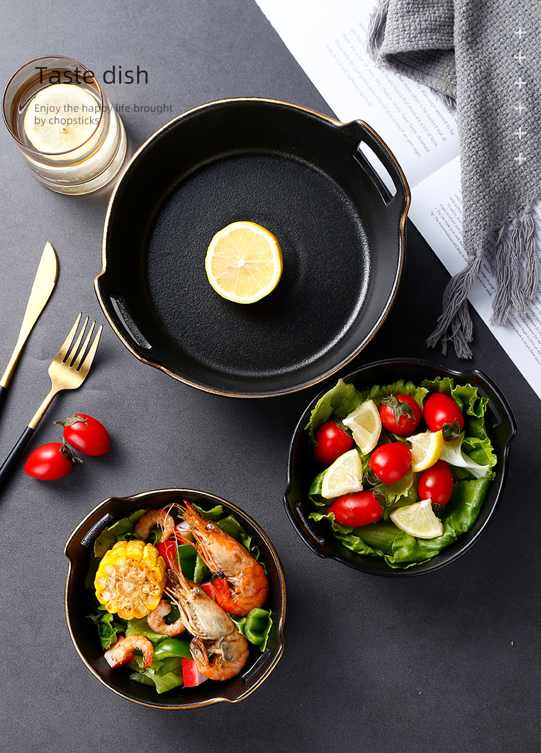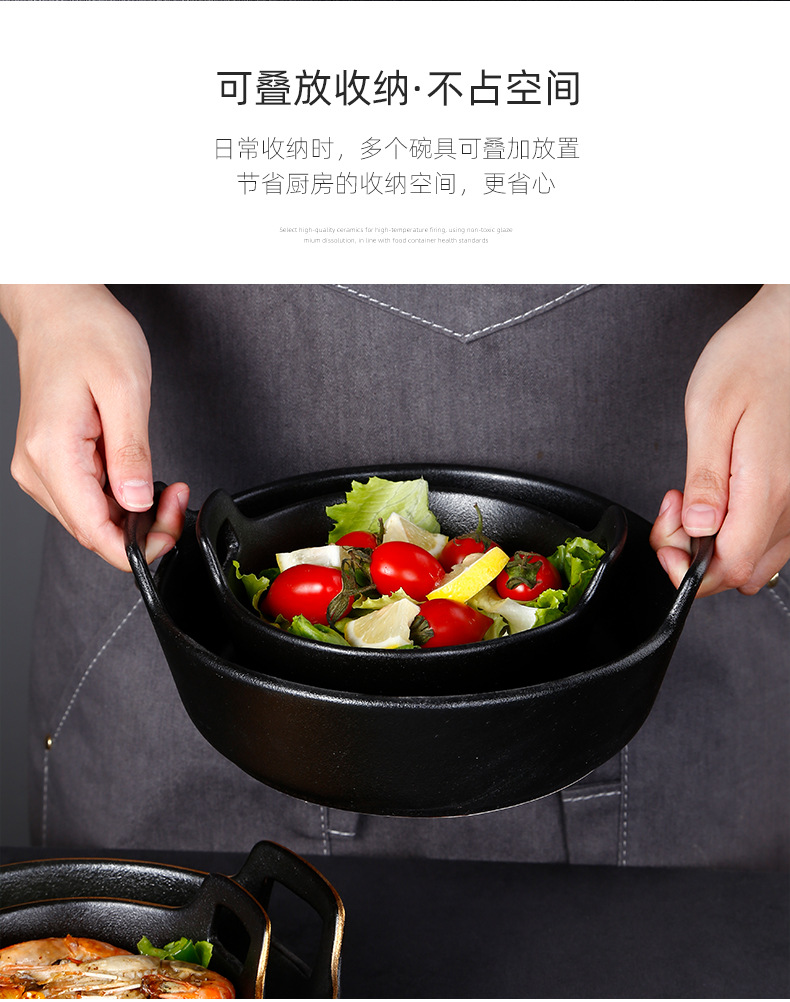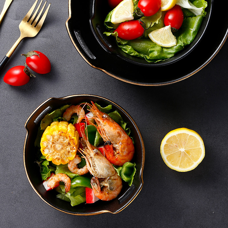 磨砂黑色釉陶瓷双耳碗创意餐厅家用带金边餐具沙拉碗烤箱洗碗机 English | 投诉