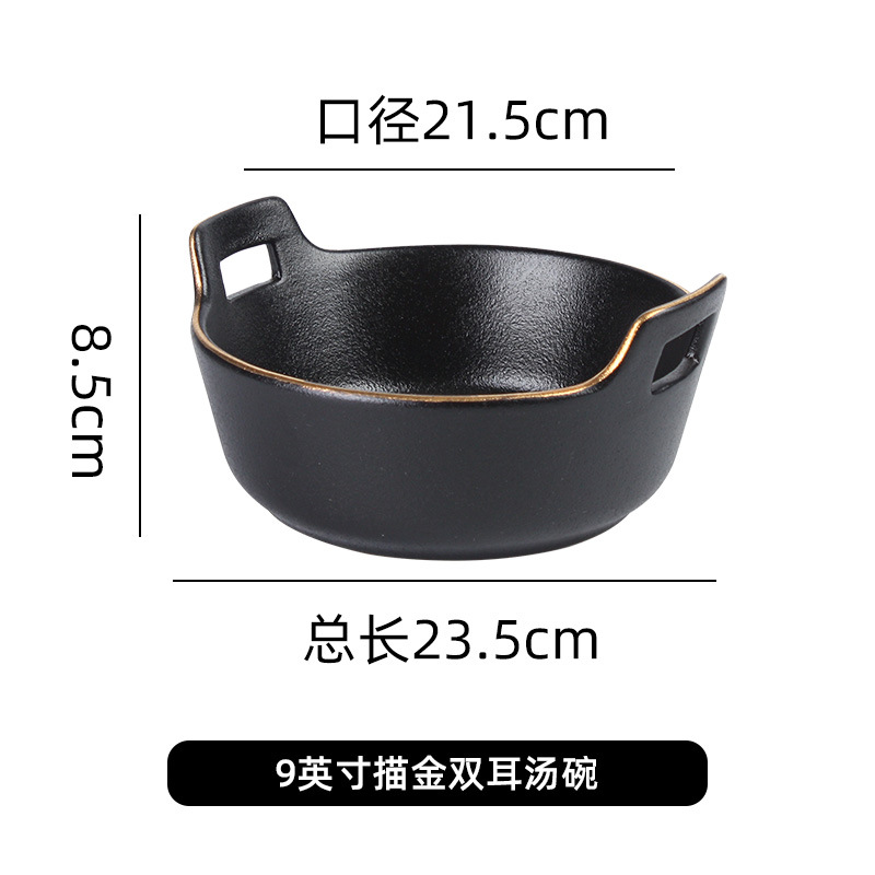 磨砂黑色釉陶瓷双耳碗创意餐厅家用带金边餐具沙拉碗烤箱洗碗机