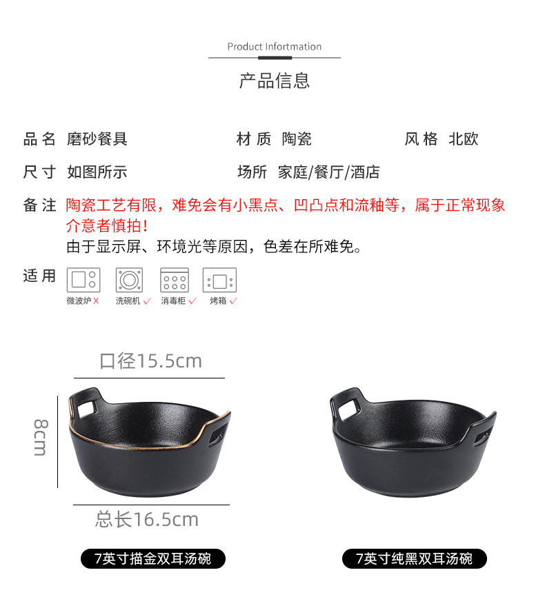品牌: 通隆 是否进口: 否 产品类别: 碗 货号: 磨砂黑双耳碗 材质: 瓷 适用人群: 成人 图案: 纯色 风格: 现代简约 形状: 圆形 微波炉: 可用