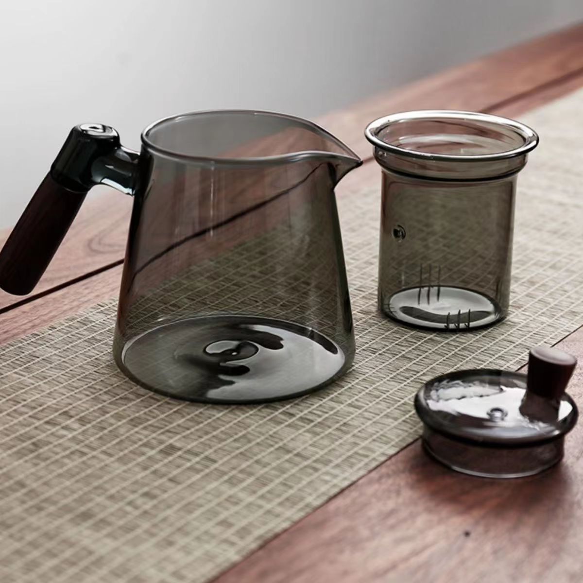现货高硼硅烟灰色泡茶壶胡桃木把玻璃茶具家用加厚茶壶套装茶壶
