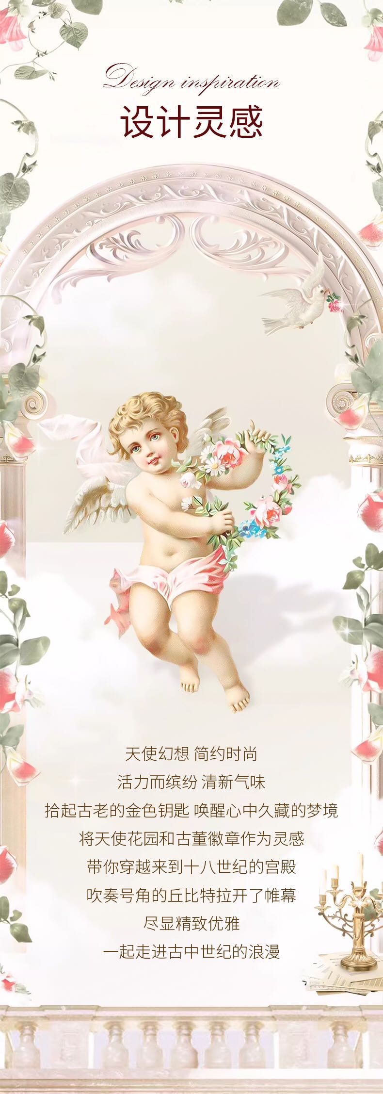 将天使花园👼和古董徽章🪙作为灵感,带你穿越来到十八世纪的宫殿🎠吹奏号角的丘比特拉开了帷幕🔭尽显精致优雅,一起走进古中世纪的浪漫🔮