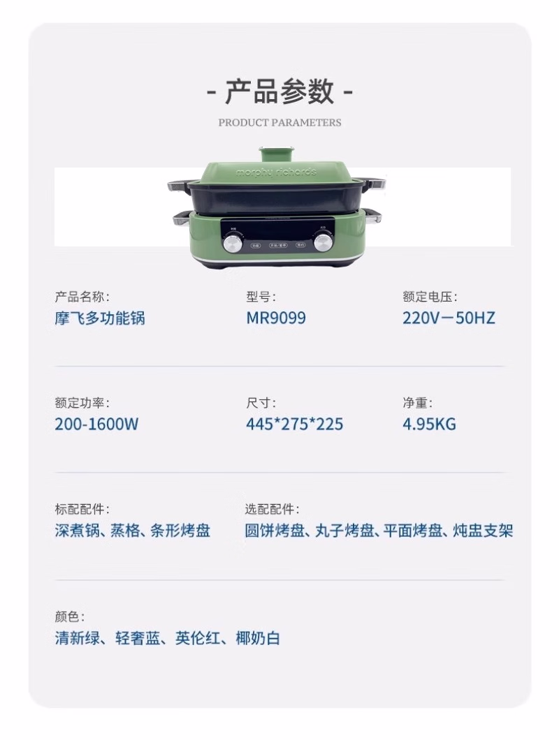 批发包邮!YOUNGFOOD智能小家电摩飞多功能锅MR9099涮蒸煮炒煎烤