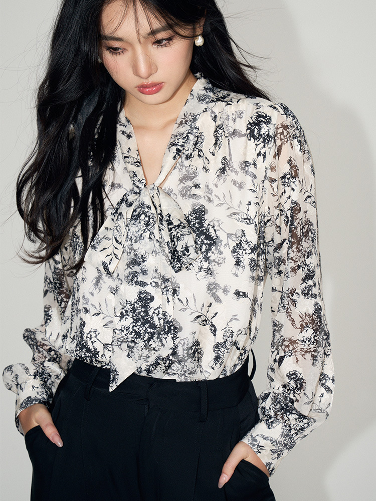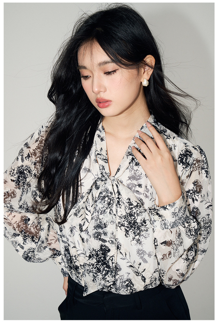 新法式复古v领飘带蝴蝶结印花高级感长袖衬衫上衣女 English | 投诉