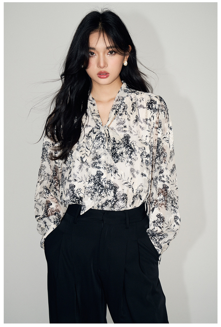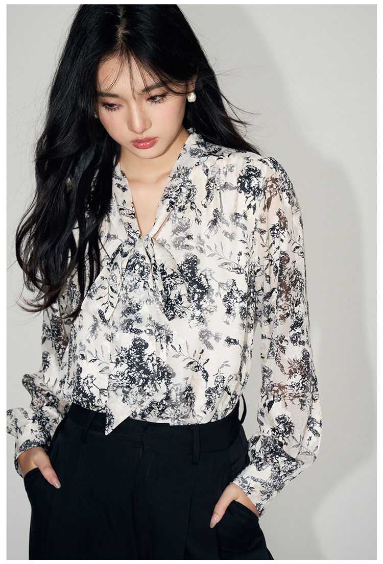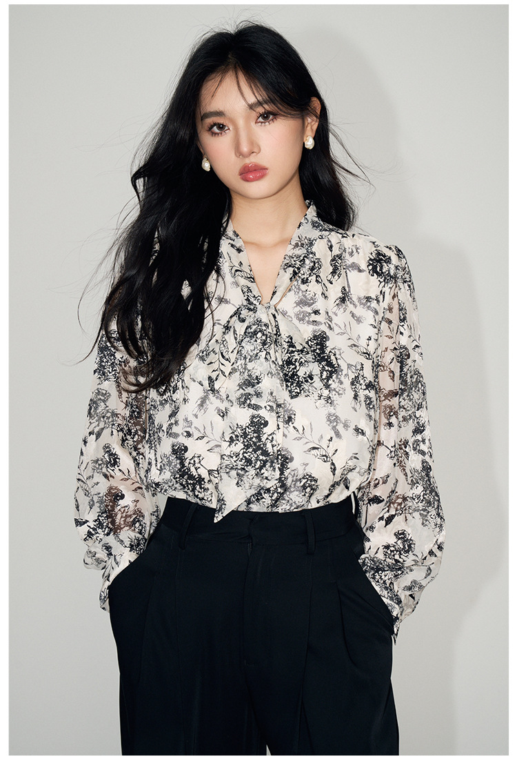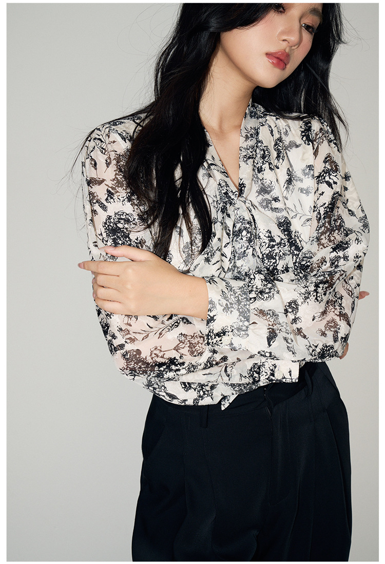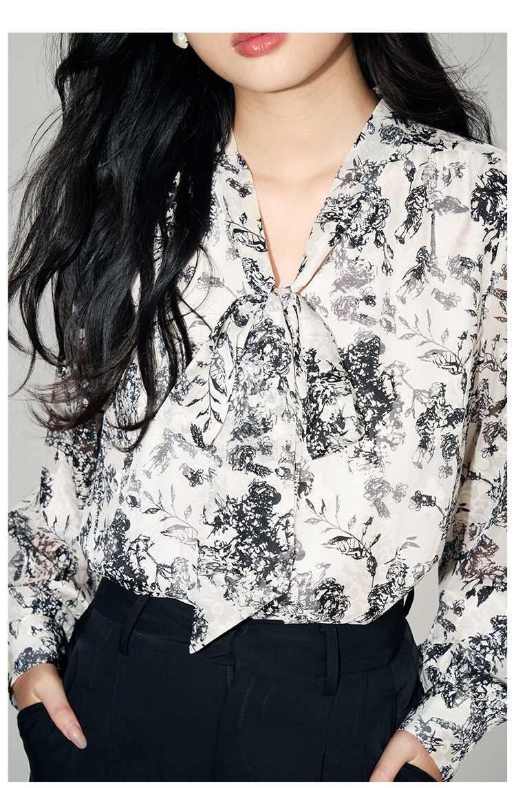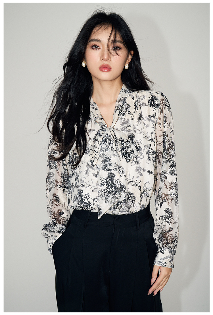 新法式复古v领飘带蝴蝶结印花高级感长袖衬衫上衣女