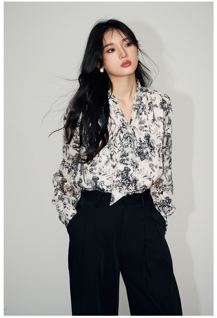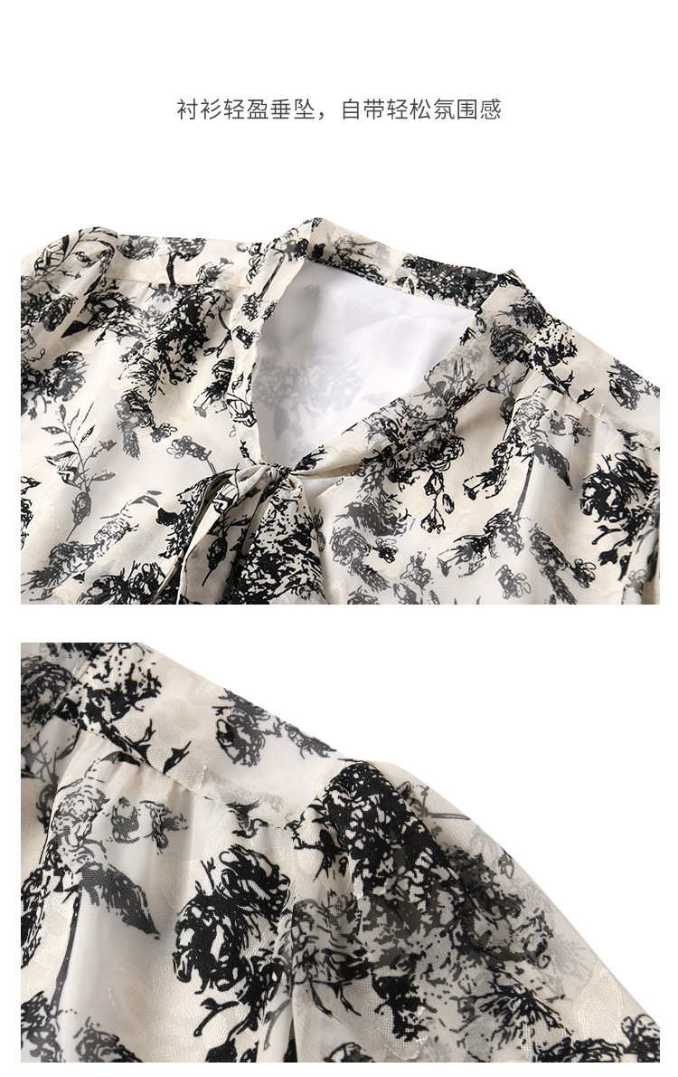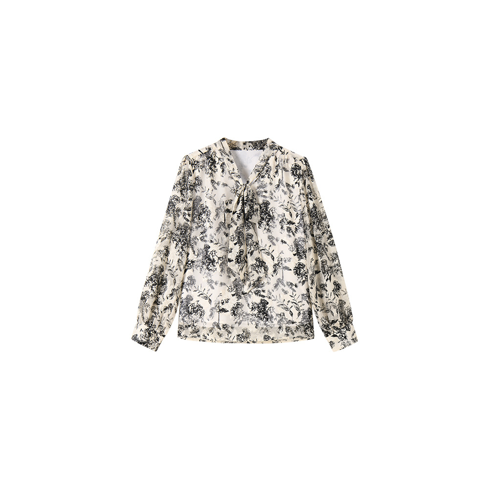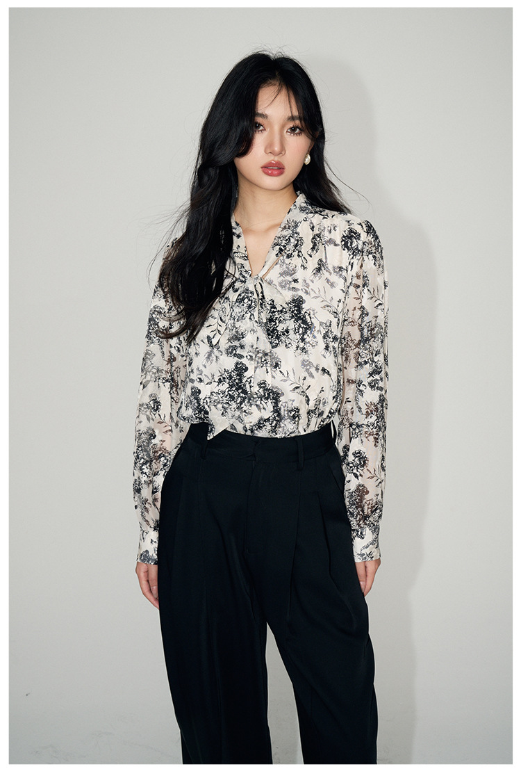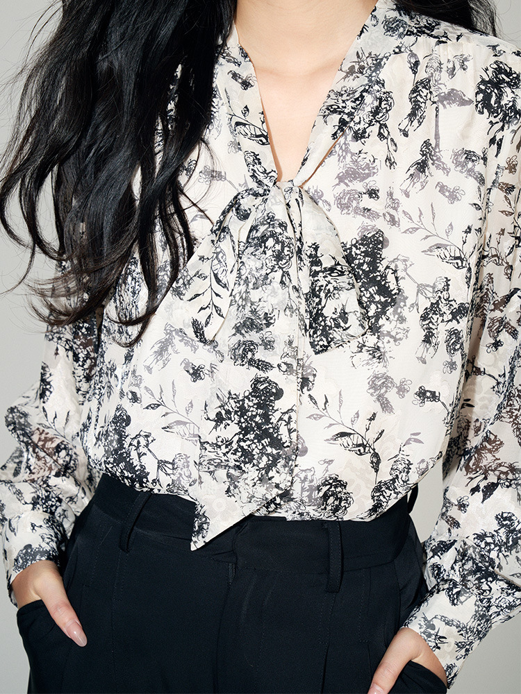 新法式复古v领飘带蝴蝶结印花高级感长袖衬衫上衣女