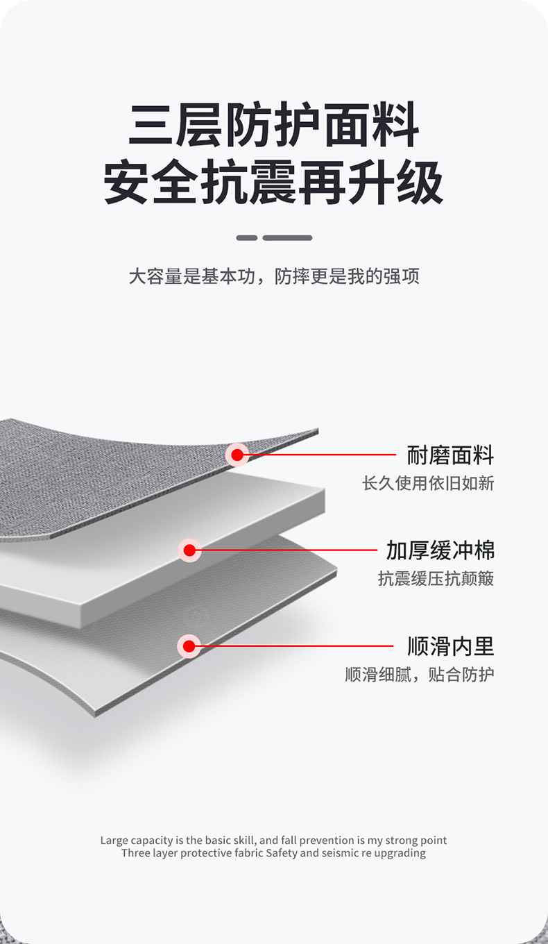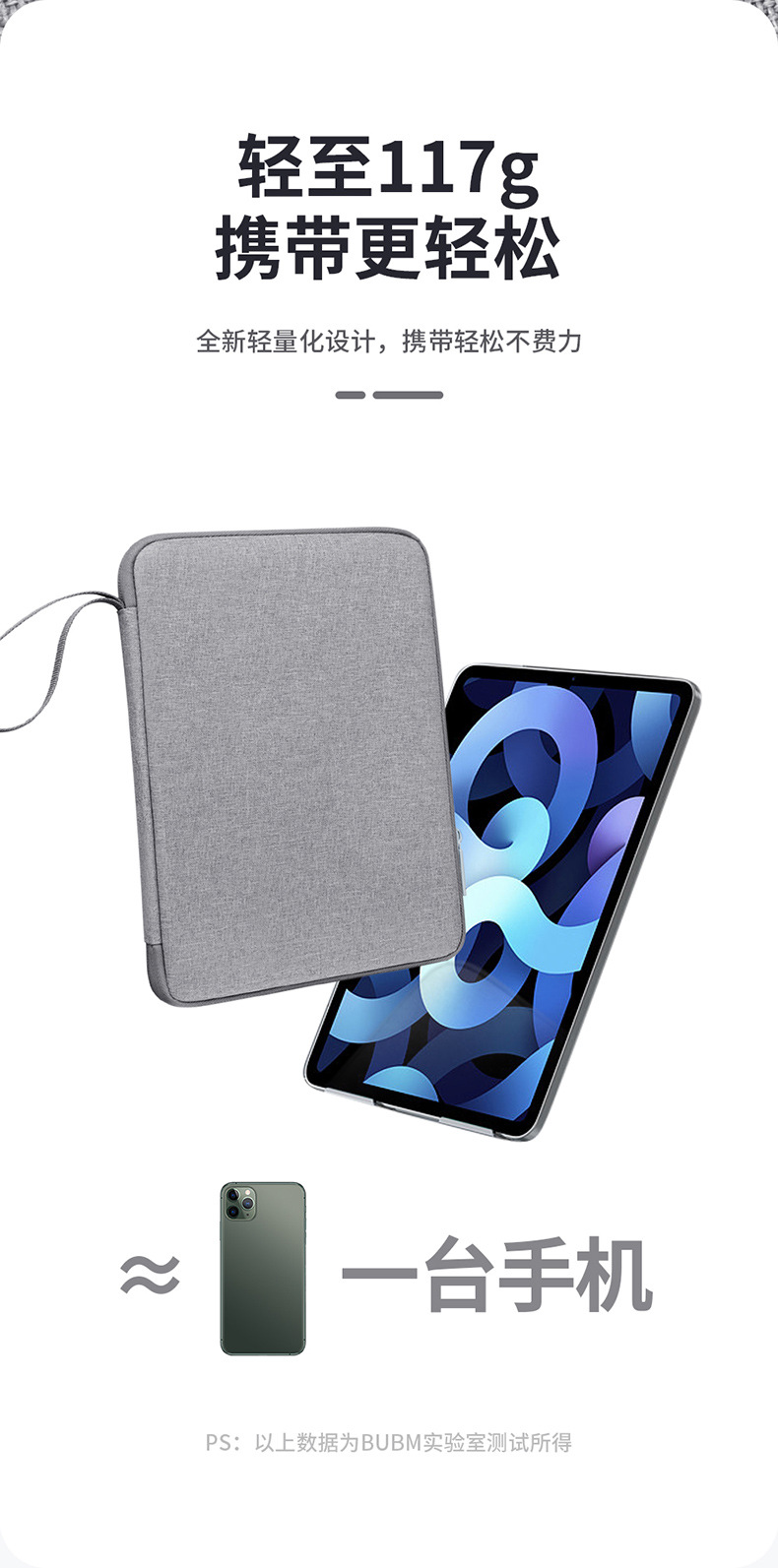 货号: BM01211003A 功能: 透气,防水,耐磨 材质: 蚂蚁布 上市年份季节: 2022年夏季 颜色: 灰色,黑色,深蓝色 尺寸: 10.9英寸,12.9英寸 品牌: BUBM 有可授权的自有品牌: 是 风格: 都市简约 容纳电脑尺寸: 12英寸 重量: 0.5 kg/个 装箱信息:长宽高:10X10X10cm 装箱重量: 1KG 装箱数量:5pcs