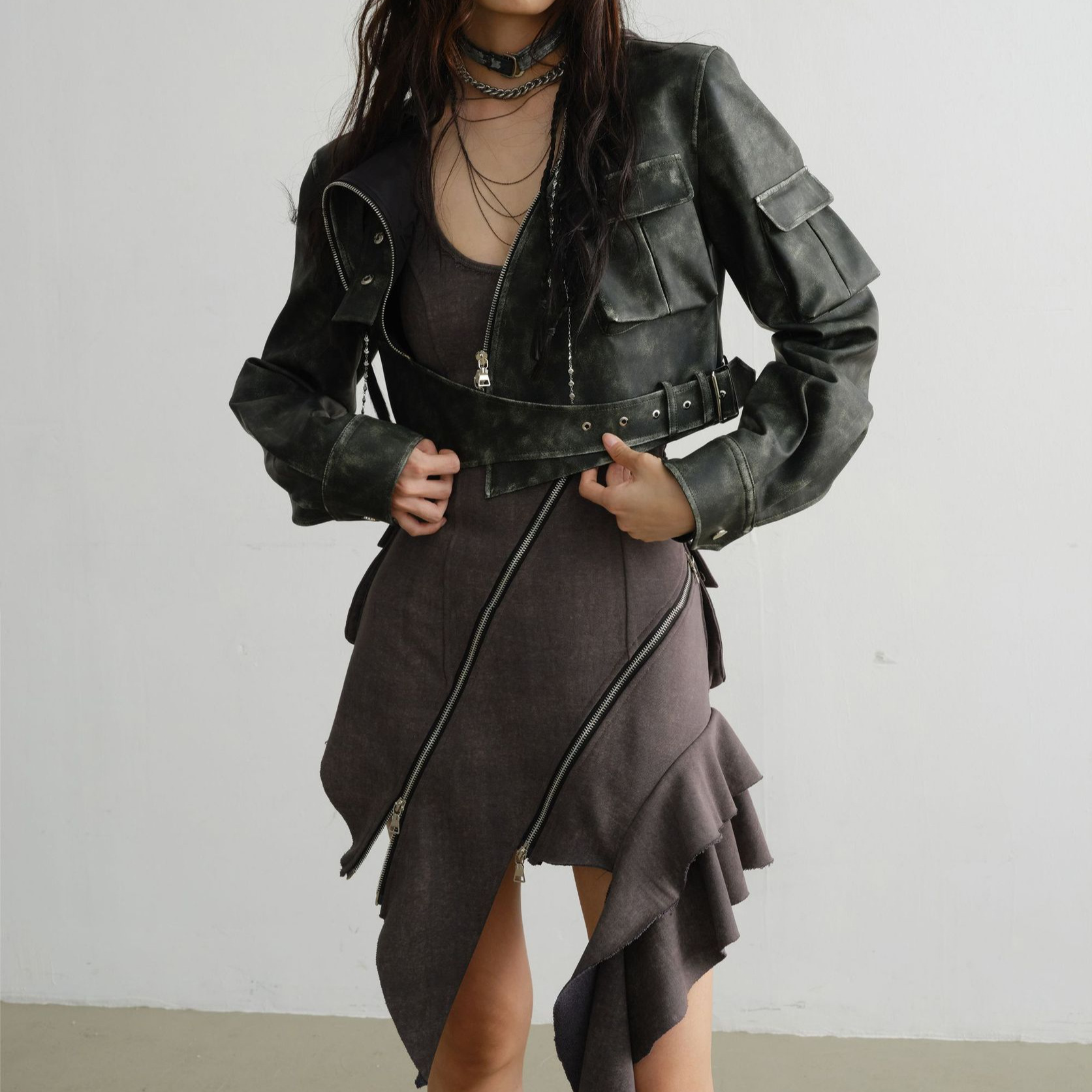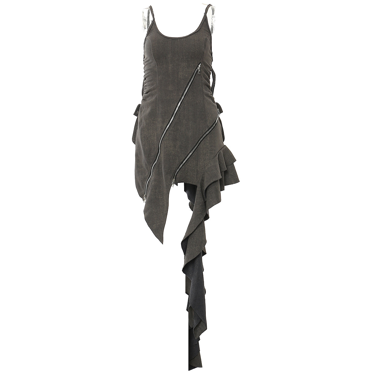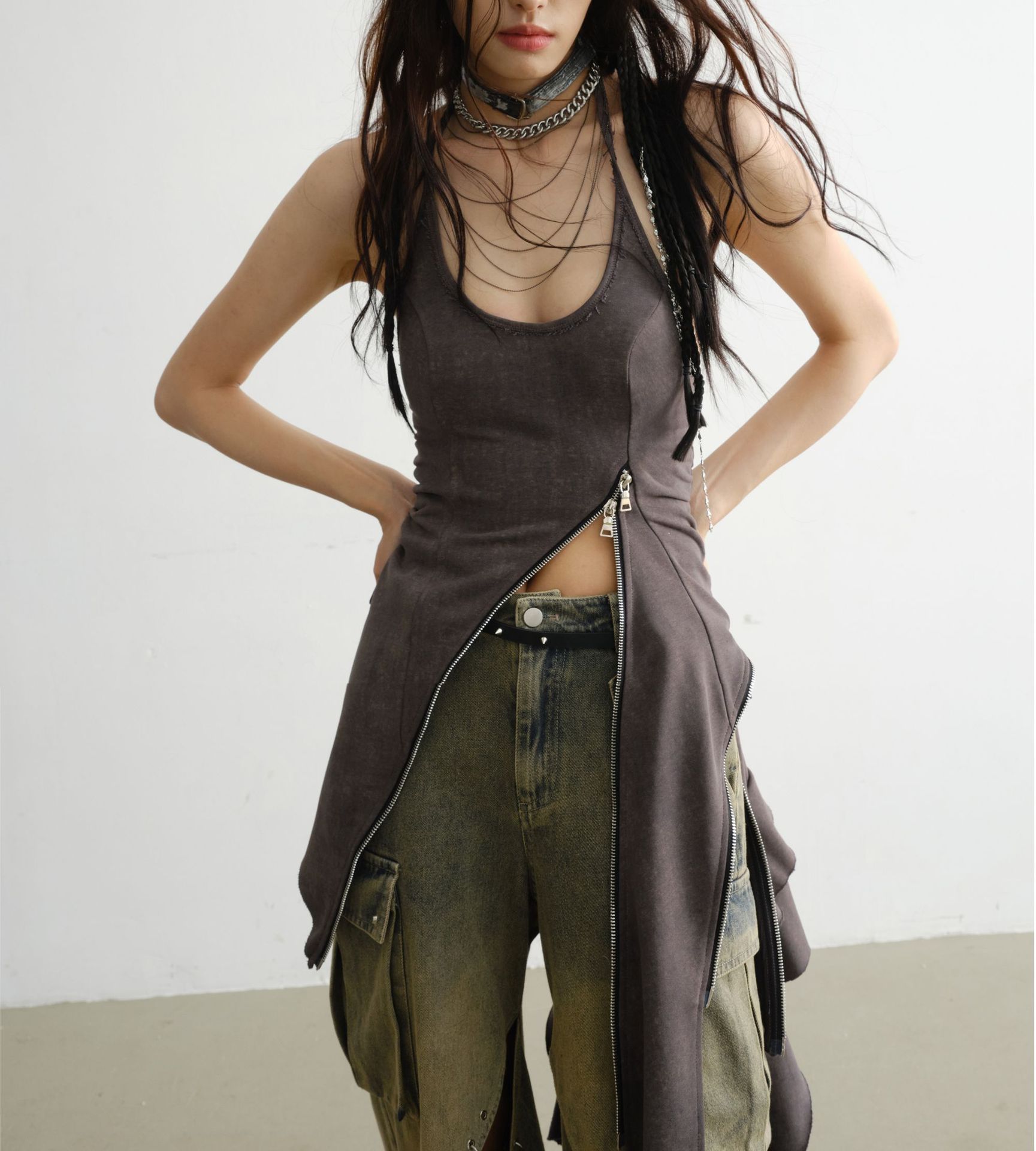 新款重工不规则裁剪拉链背心连衣裙 女