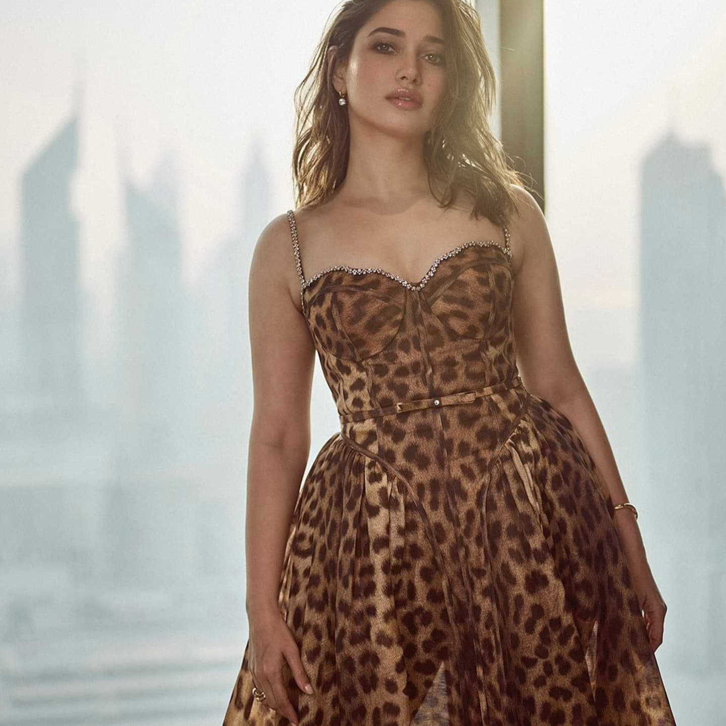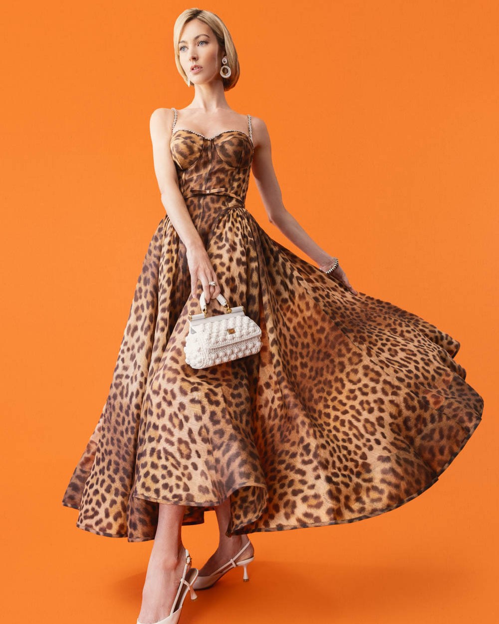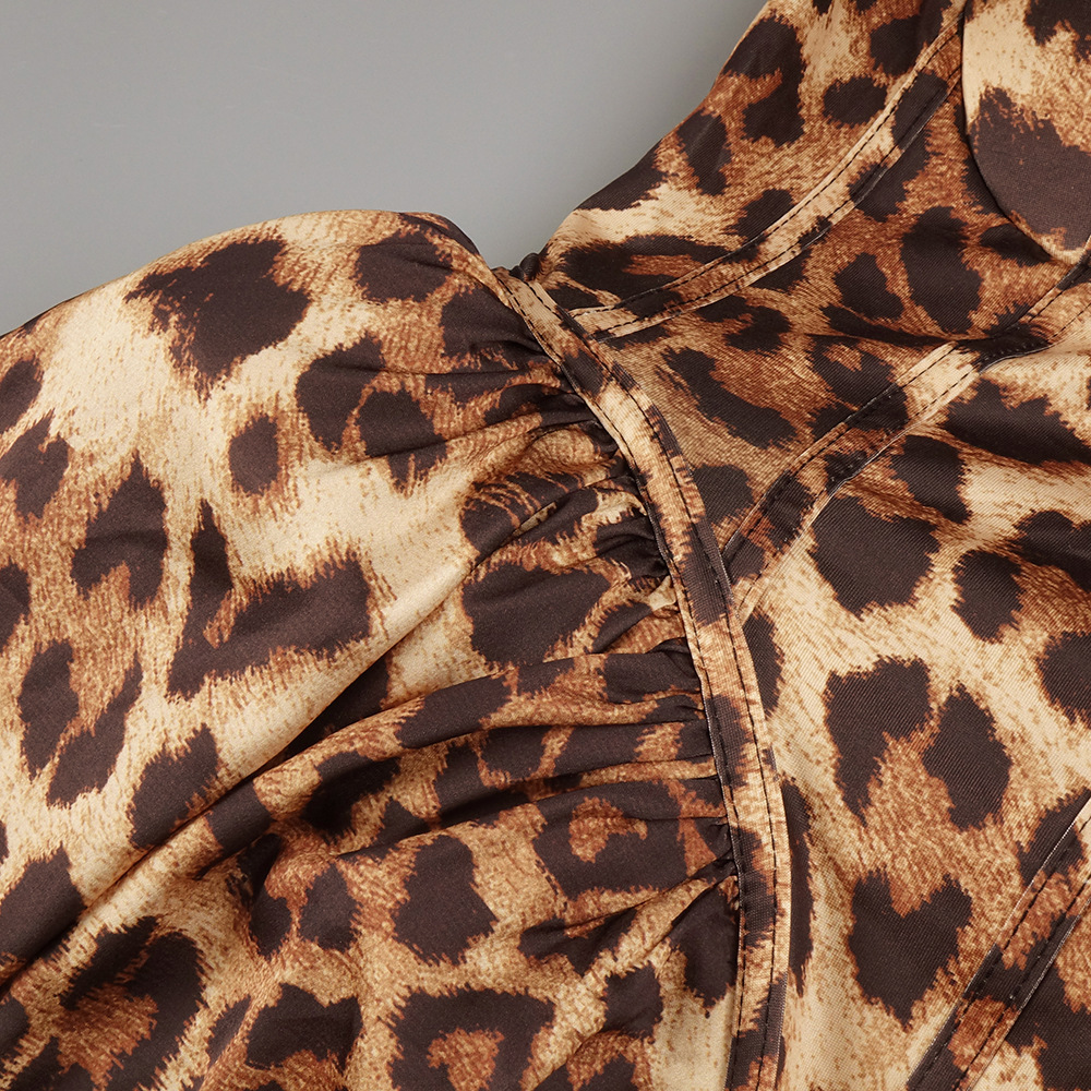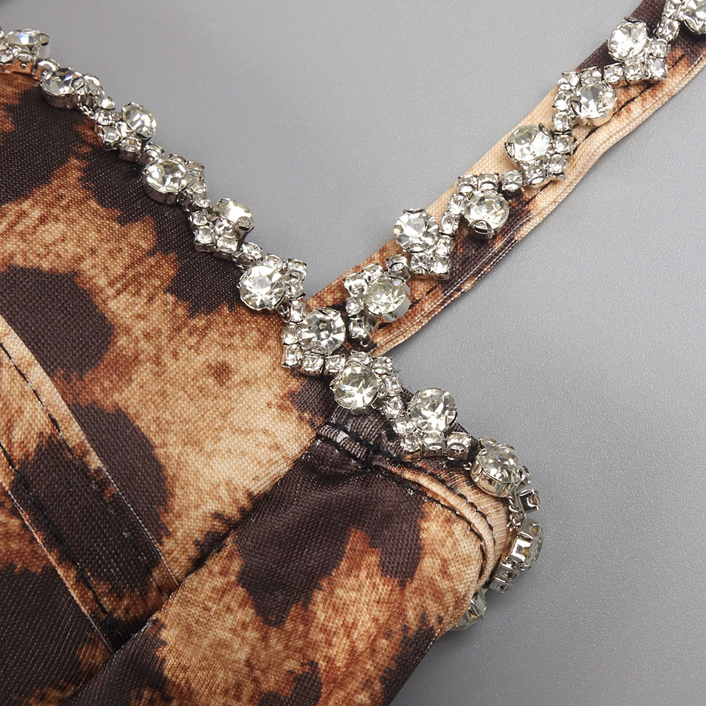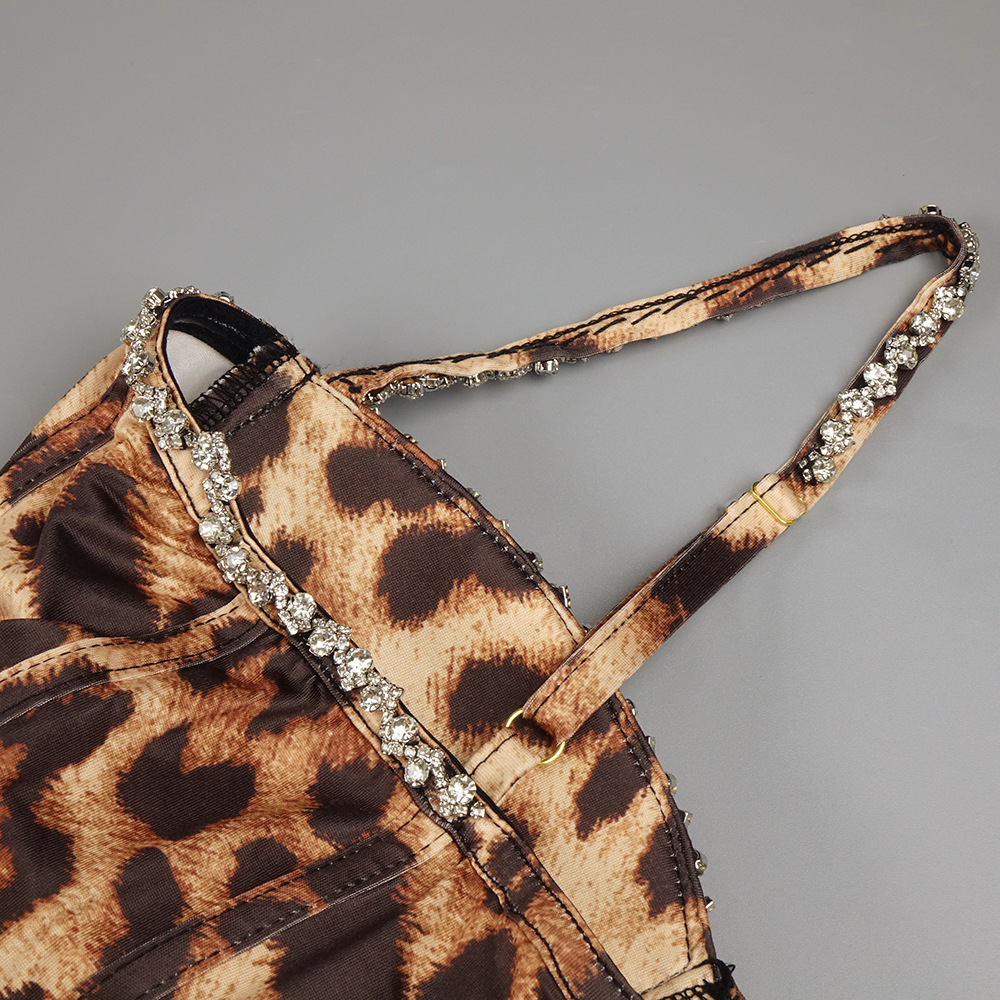 欧美小众性感豹纹钉钻蓬蓬吊带连衣裙复古收腰晚宴礼服
