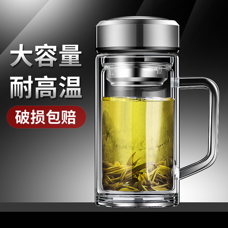 双层玻璃杯带把手家用带把玻璃杯带盖泡茶杯批发水杯玻璃杯子批发
