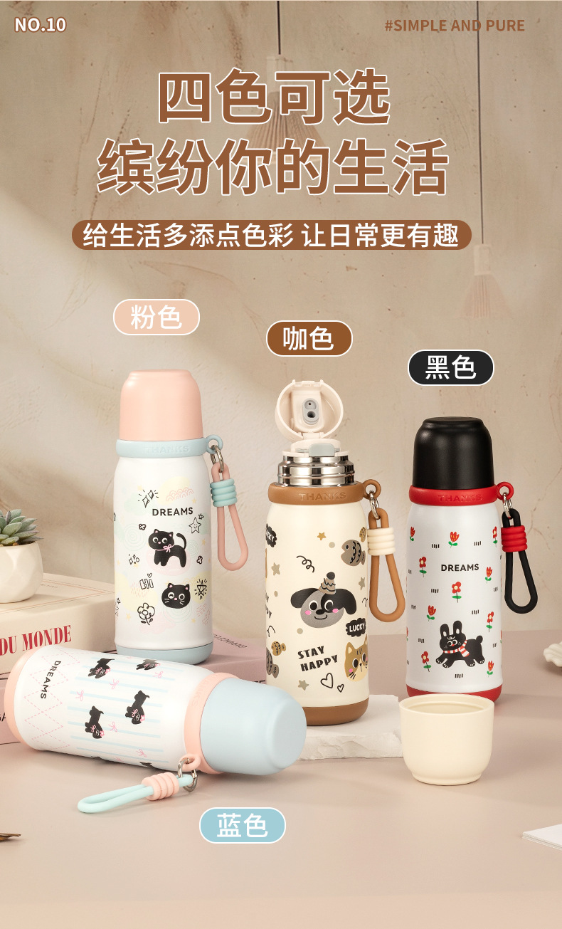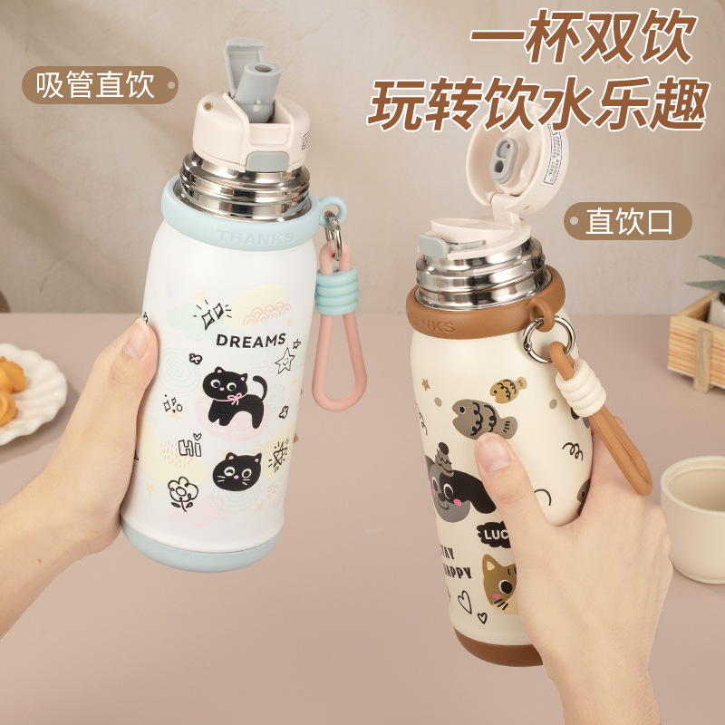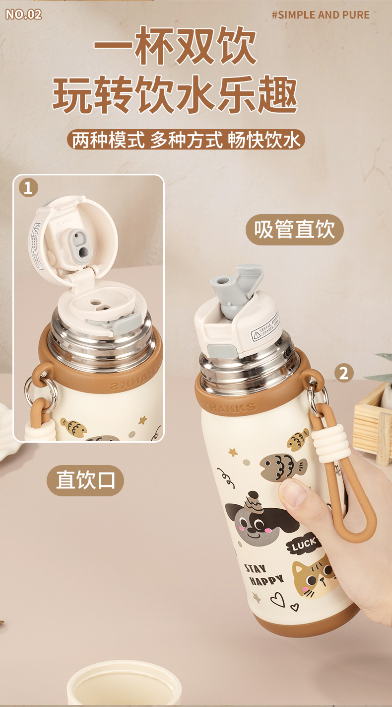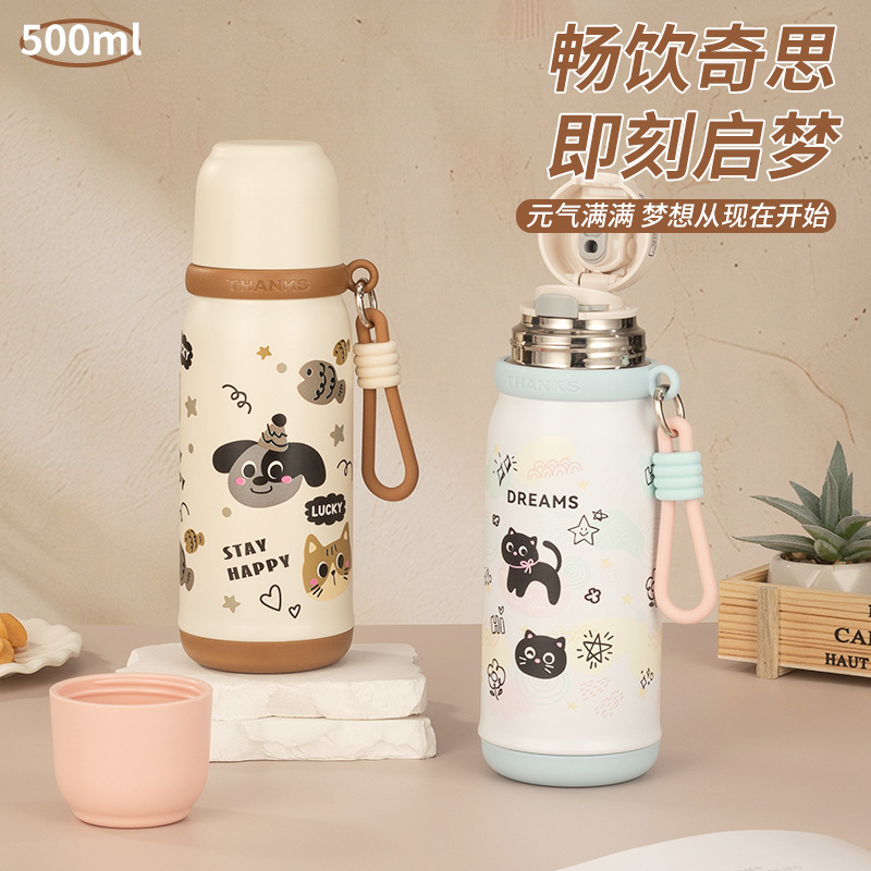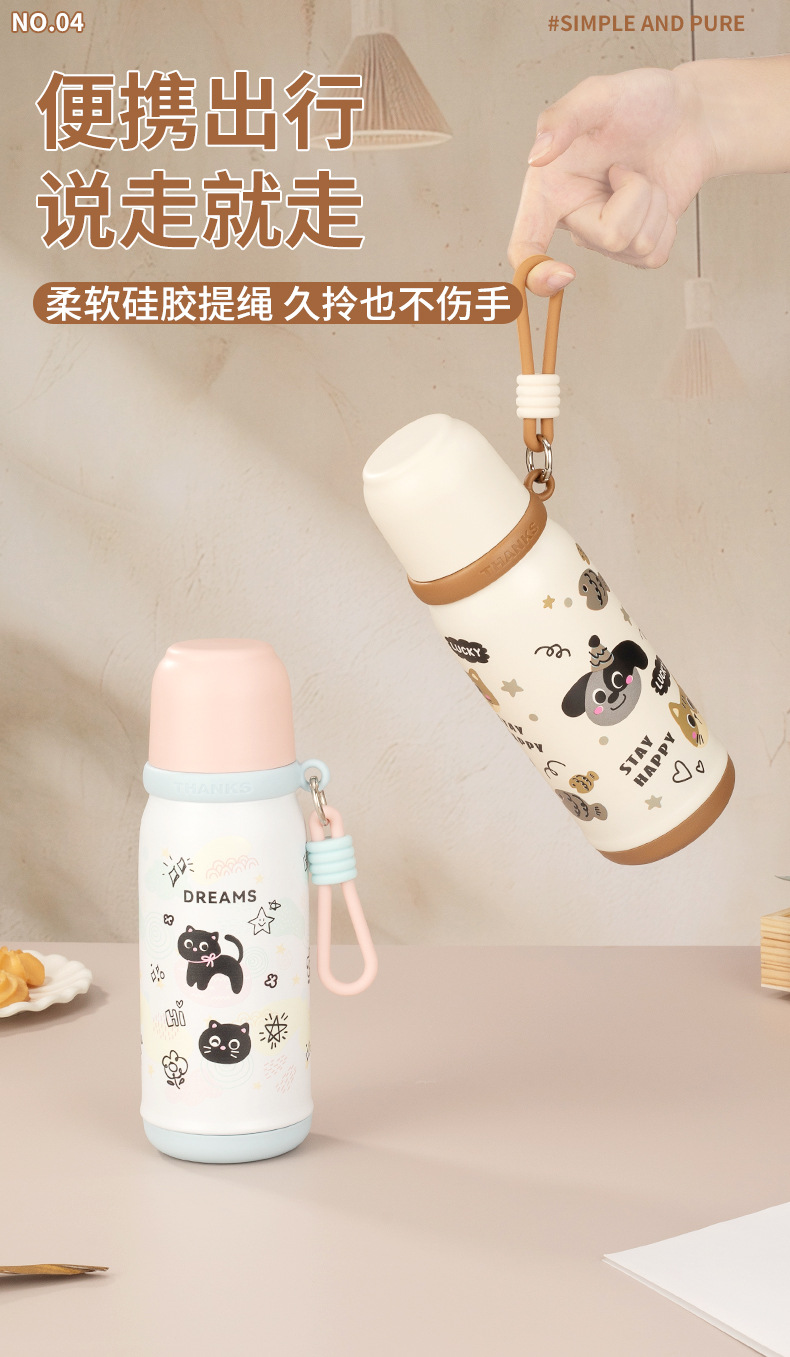 316不锈钢儿童保温杯一杯两盖可爱时尚男女学生杯便携提绳随行杯