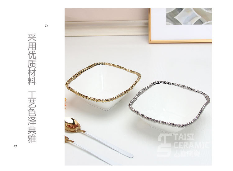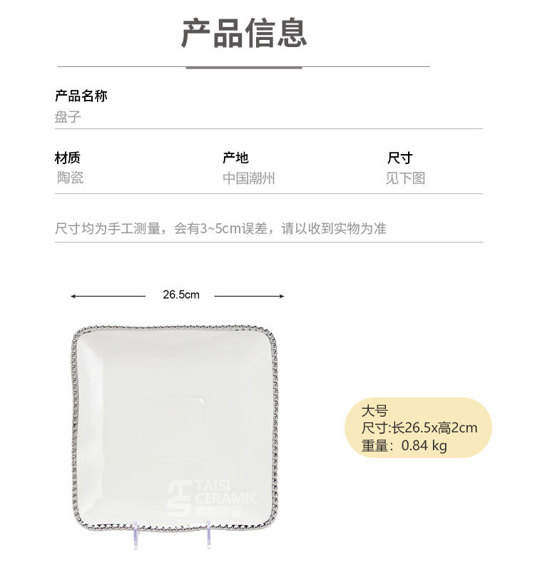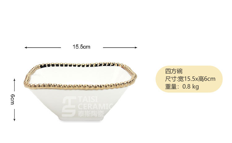 品牌: 潮州泰斯陶瓷厂 货号: RP002 产品类别: 餐具 材质: 瓷 是否进口: 否 适用人群: 通用 图案: 珠点 风格: 轻奢风 形状: 方形 微波炉: 不可用