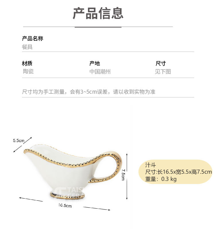 产地: 潮州 品牌: 泰斯陶瓷 颜色: 牛油碟,黑椒酱料汁斗 材质: 陶瓷 适用对象: 成人,老人 风格: 轻奢 是否有专利: 否 是否跨境出口专供货源: 是 主要销售地区: 其他 主要下游平台: 其他