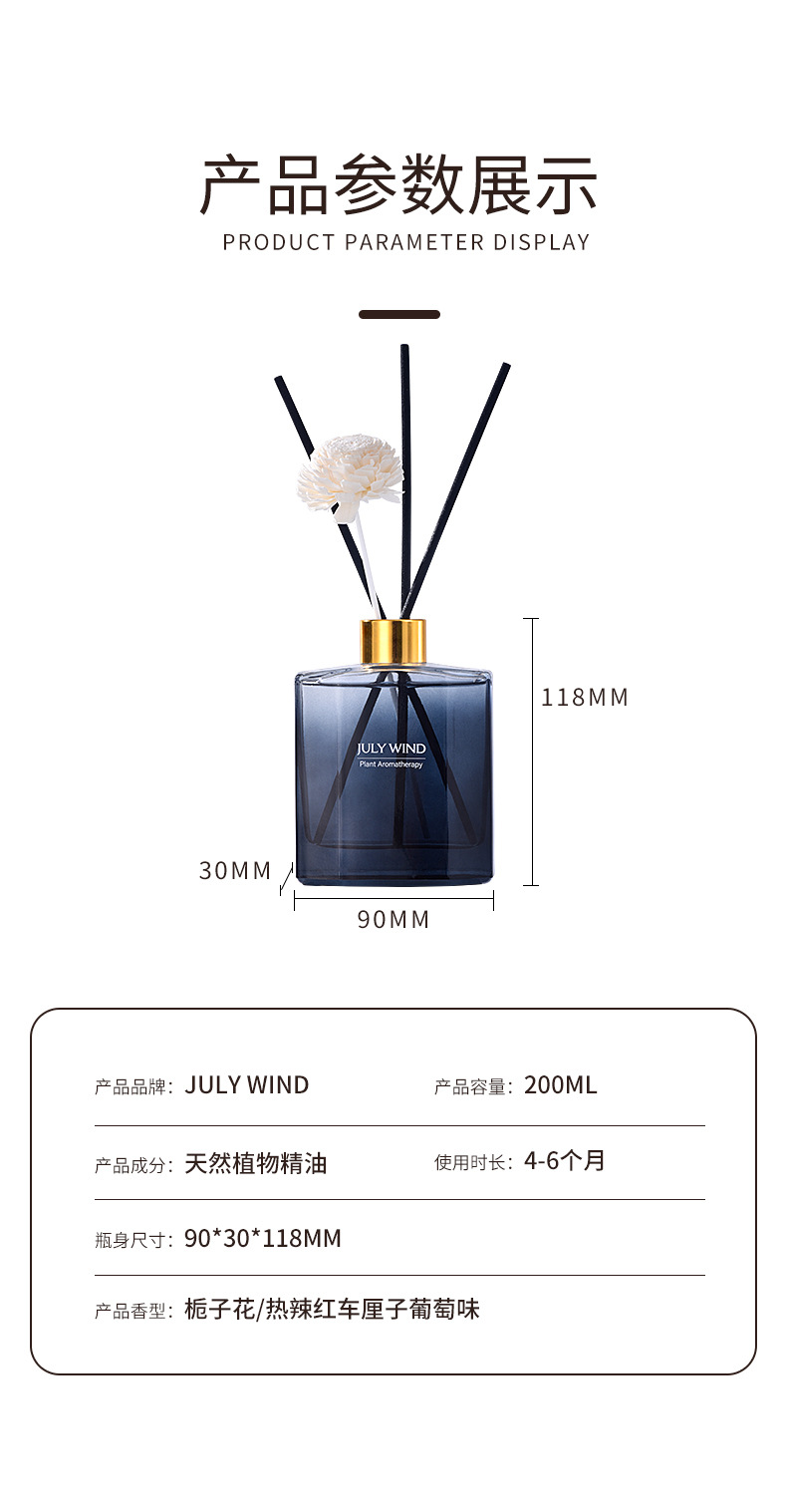 种类: 无火香薰 香氛 功能: 空气清新 持续扩散 工艺: 藤条 扩香棒 物理形态: 液体 重量: 0.5 kg/瓶 装箱信息:长宽高:50X50X50cm 装箱重量: 50KG 装箱数量:50pcs
