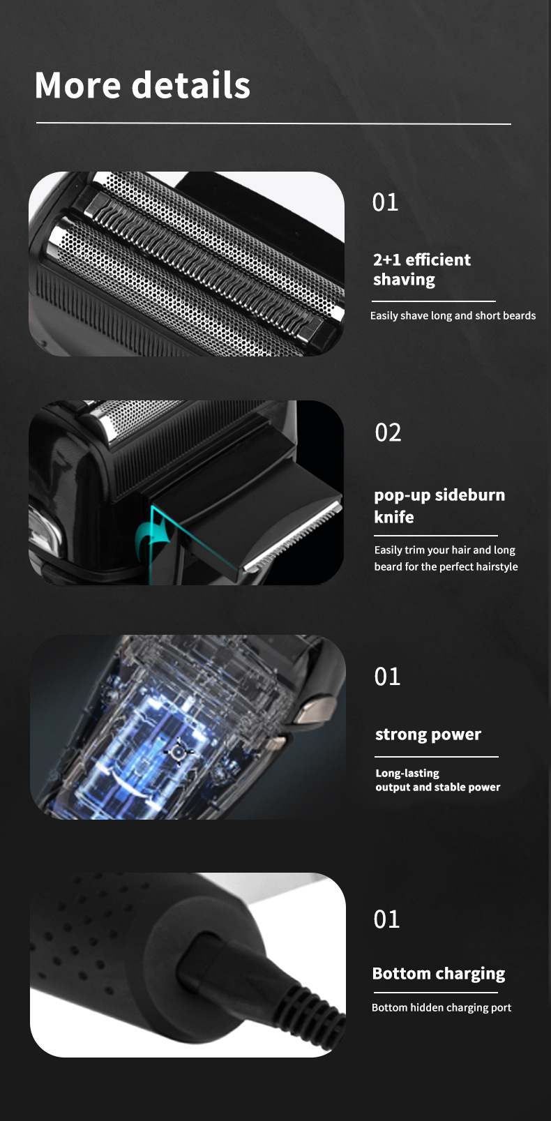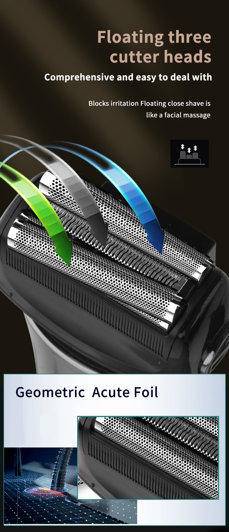 品牌: WAIKIL 功能: 全身水洗,浮动刀头,贴面调校 剃须刀刀头: 往复式2刀头 清洁方式: 全身水洗 续航时间: 60分钟以上 颜色: 灰色 规格: WL-7100 电源方式: 充电款 电机类型: 有刷电机 是否有浮动结构: 是 重量: 0.5 kg/件