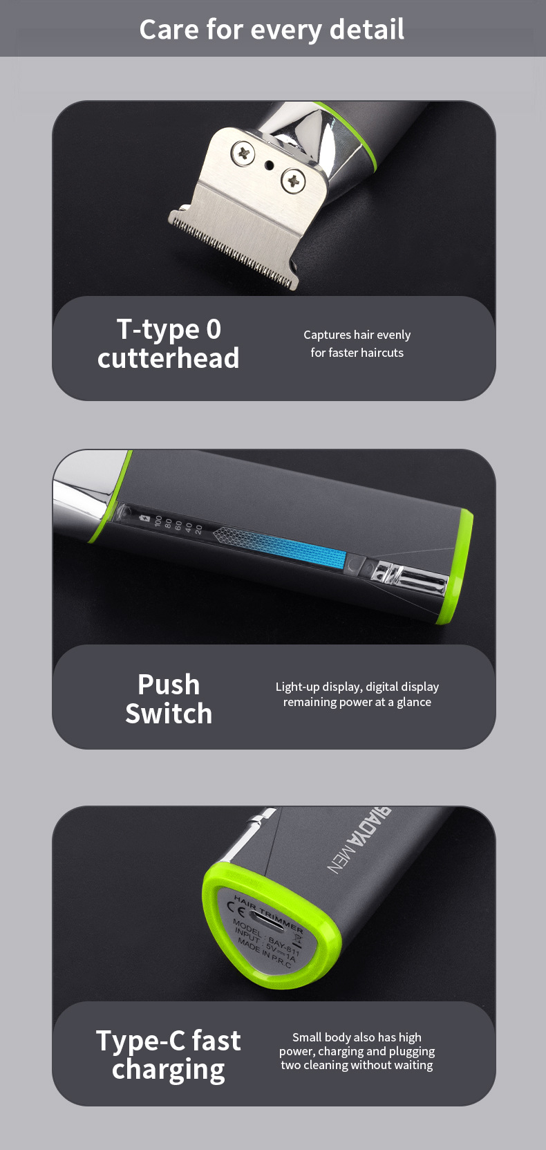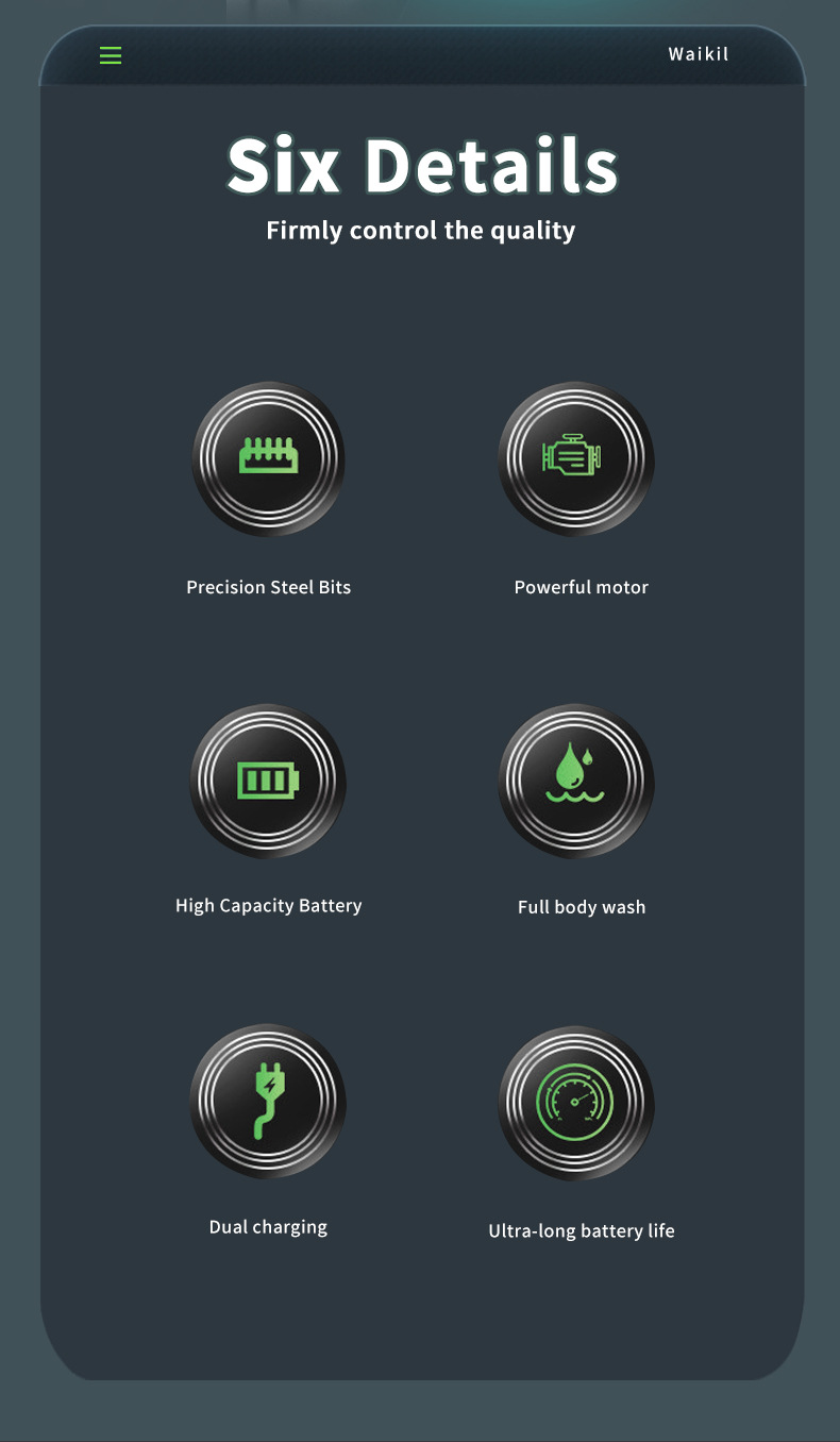 品牌: WAIKIL 电源方式: 充电式 型号: BAY-811 刀头材质: 不锈钢 清洁方式: 刀头可拆卸水洗 是否有自动研磨刀头: 否 证书类型: ce 适用人群: 通用 规格: WL-811绿边,WL-811橙边,WL 功率: 5(W) 重量: 0.5 kg/个