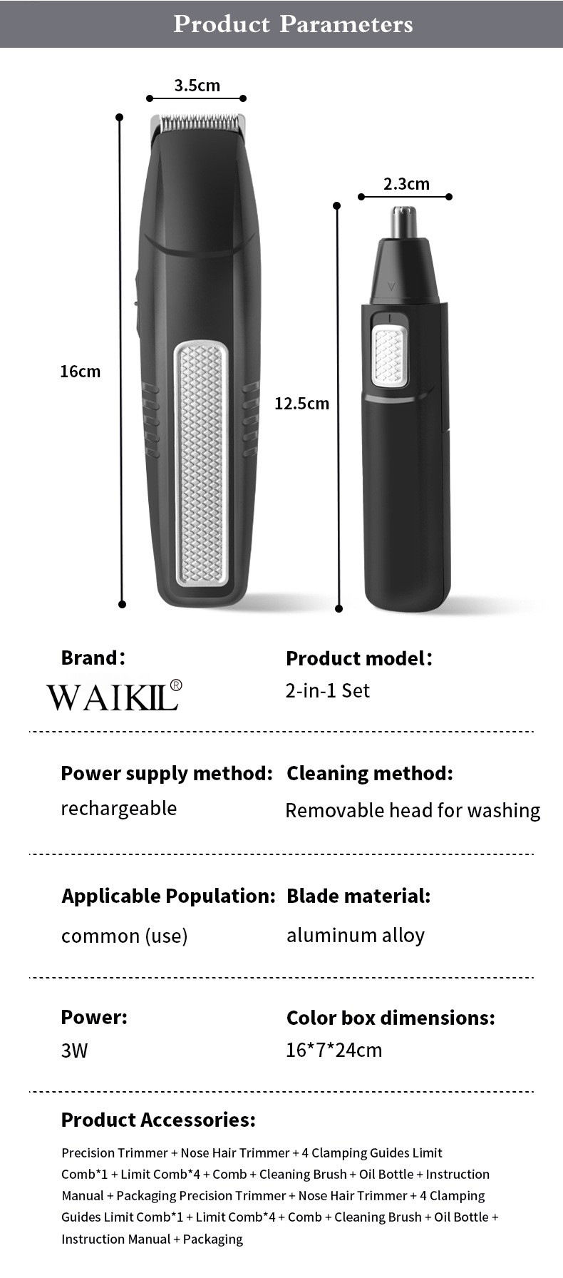 品牌: WAIKIL 电源方式: 充电式 型号: PG-6100 刀头材质: 不锈钢 清洁方式: 刀头可拆卸水洗 是否有自动研磨刀头: 否 证书类型: CE 适用人群: 通用 规格: 6100 功率: 5(W) 重量: 0.5 kg/个