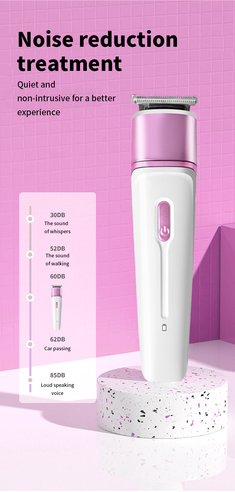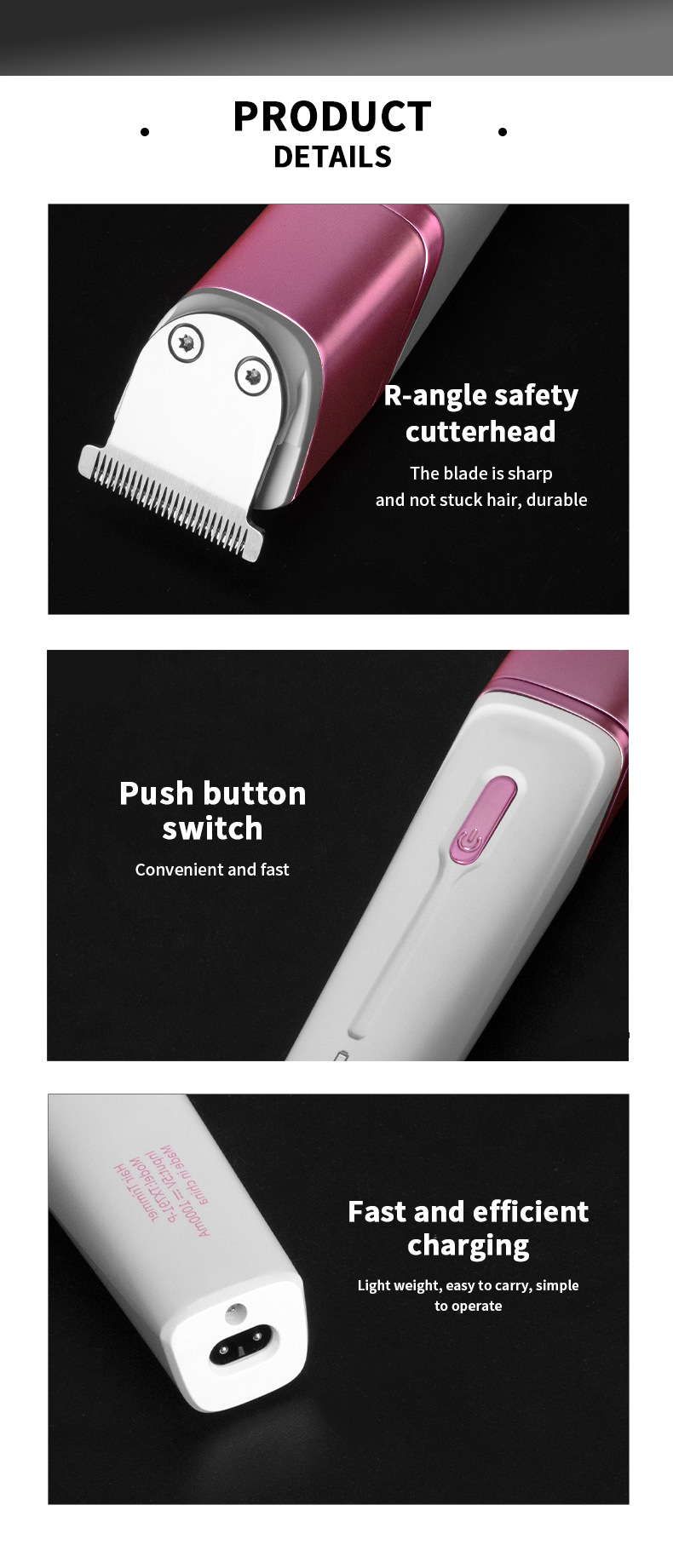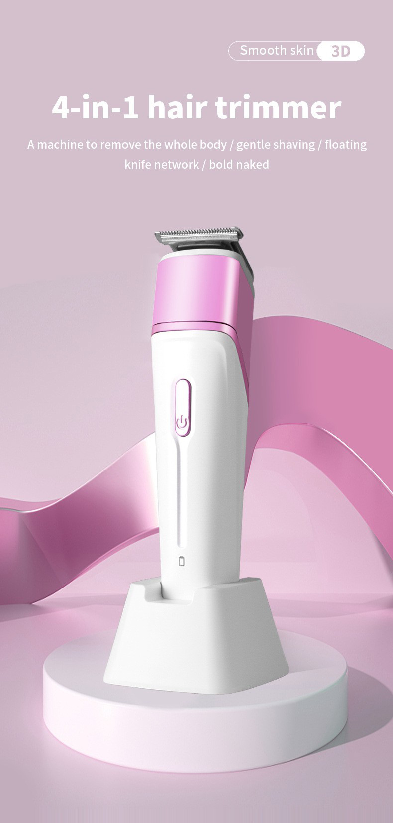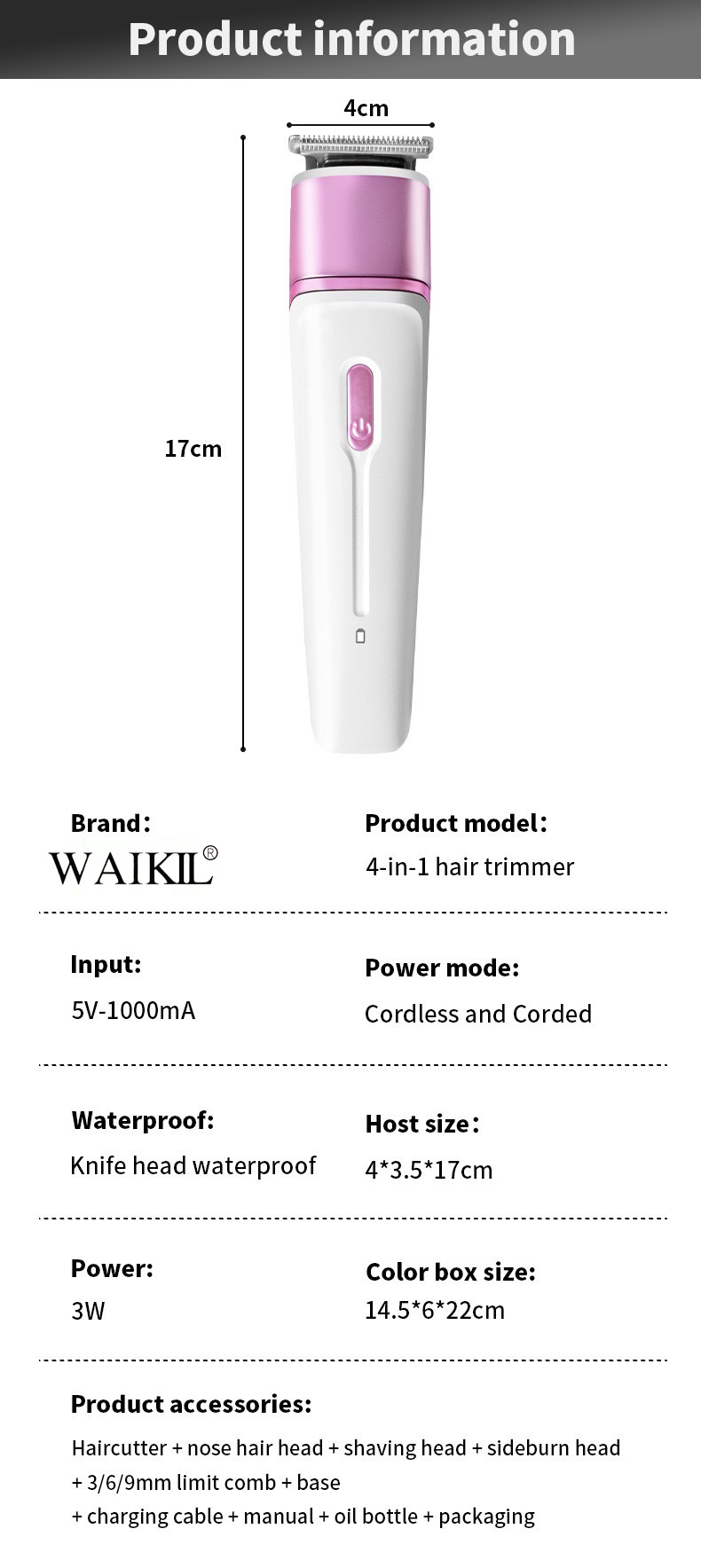 品牌: WAIKIL 电源方式: 充电式 型号: WL-893 刀头材质: 不锈钢 清洁方式: 刀头可拆卸水洗 是否有自动研磨刀头: 否 证书类型: CE 适用人群: 通用 规格: 粉色 功率: 45(W) 重量: 0.5 kg/个