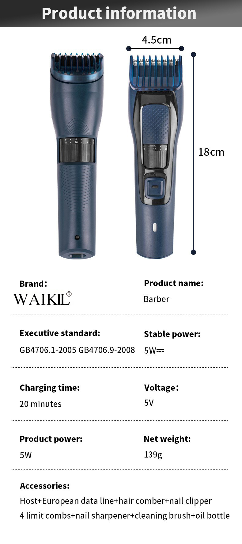 品牌: WAIKIL 电源方式: 充电式 型号: WL-4422 刀头材质: 不锈钢 清洁方式: 刀头可拆卸水洗 是否有自动研磨刀头: 否 证书类型: CE,FCC,ROHS 适用人群: 通用 规格: WL-4422 功率: 5(W) 重量: 0.5 kg/个