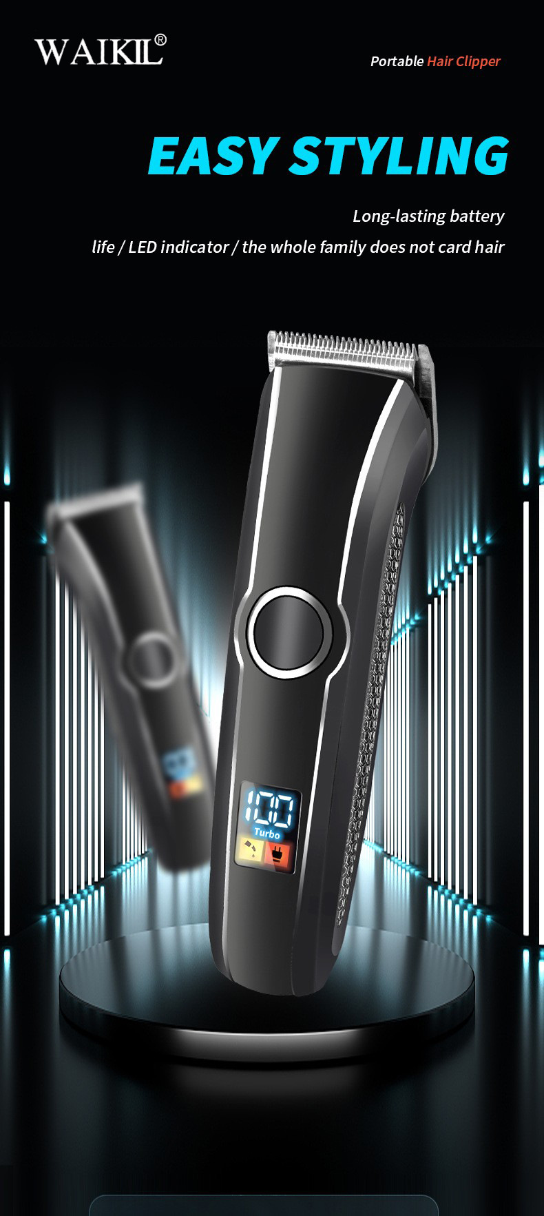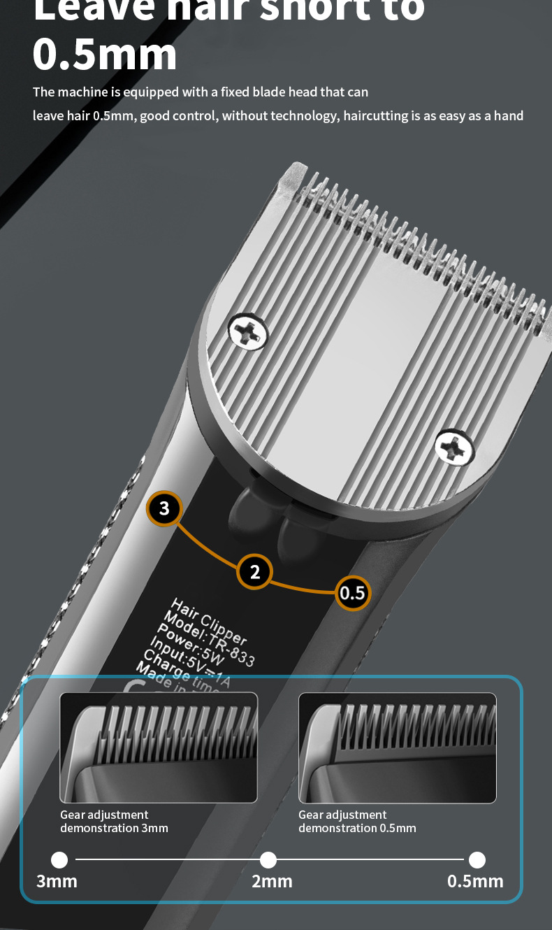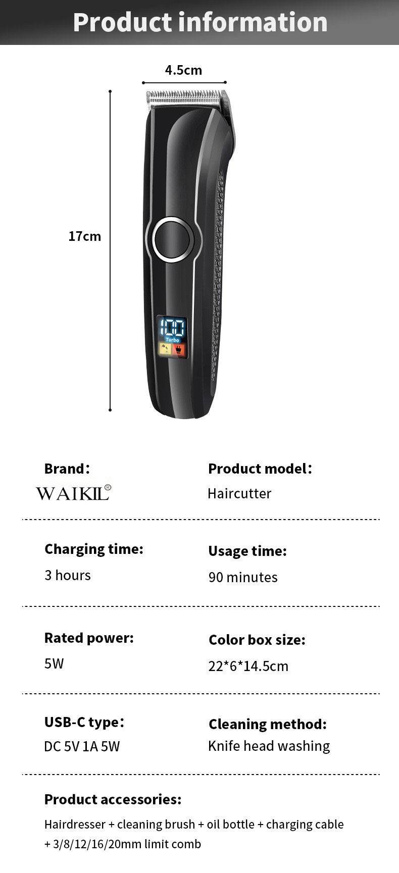品牌: WAIKIL 电源方式: 充电式 型号: TR-833 刀头材质: 不锈钢 清洁方式: 刀头可拆卸水洗 是否有自动研磨刀头: 否 证书类型: CE,FCC,ROS 适用人群: 通用 规格: TR-833-数显,TR-833-无数显 功率: 5(W) 重量: 0.5 kg/个