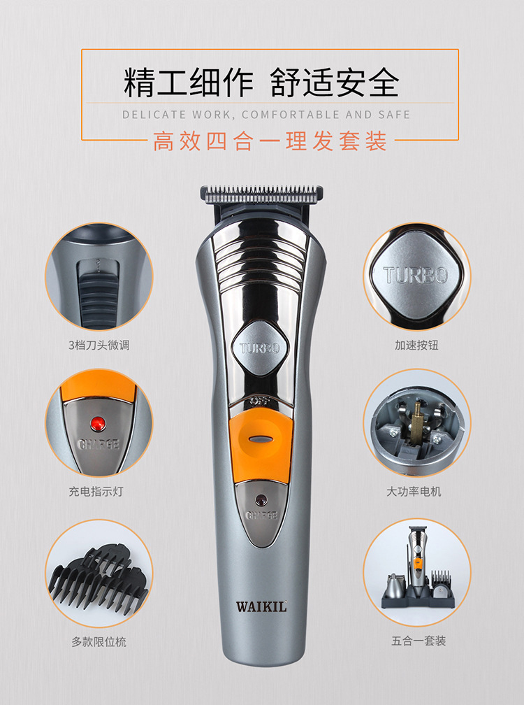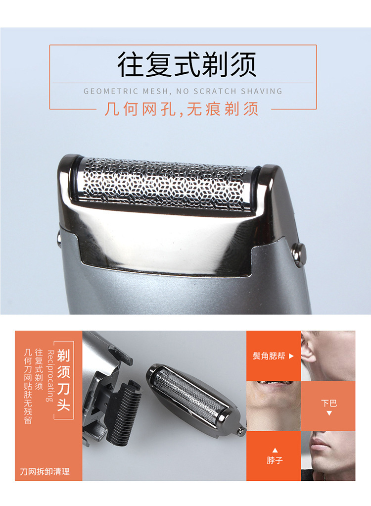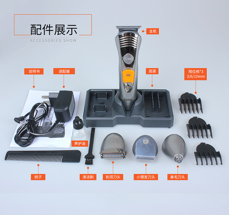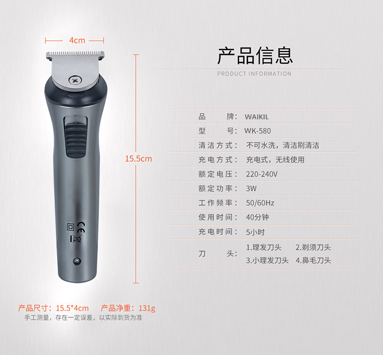 品牌: WAIKIL 电源方式: 充电式 尺寸: 580 清洁方式: 刀头可拆卸水洗 适用人群: 通用 是否防水: 否 电机类型: 有刷电机 型号: WL-580 刀头材质: 不锈钢 货号: 580 重量: 0.5 kg/个
