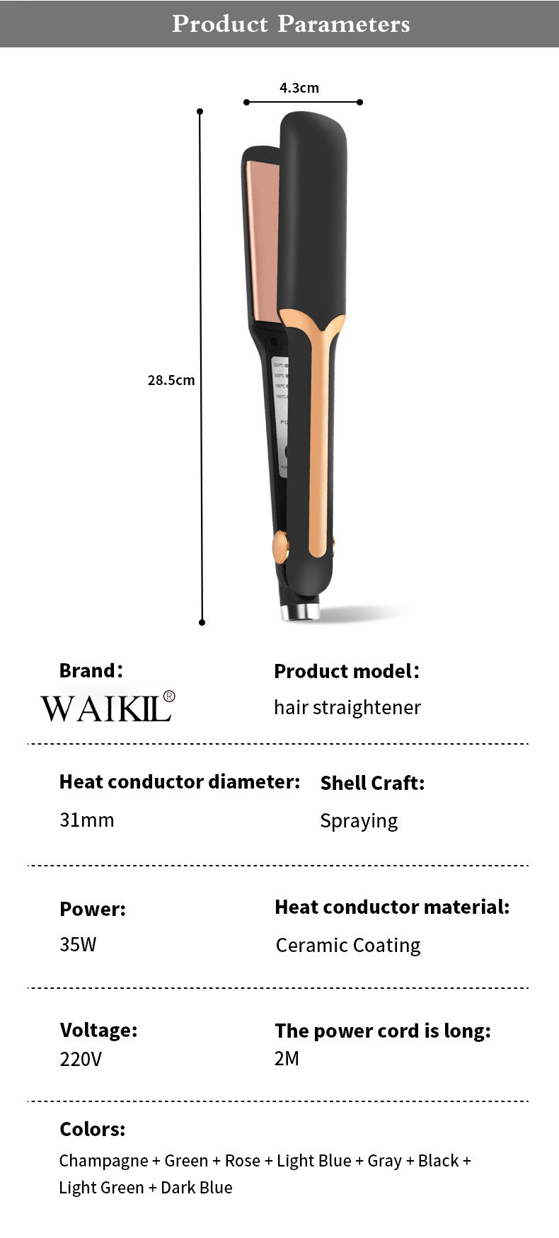 导热体直径: 16MM-20MM 产品类别: 直发器 供电方式: 有线(交流电) 导热体材质: 电气石陶瓷 温控调校: 10段 功能: 直发卷发 证书类型: ce 品牌: WAIKIL 适用发质: 干发 最佳造型时间: 3-5分钟 重量: 0.5 kg/个