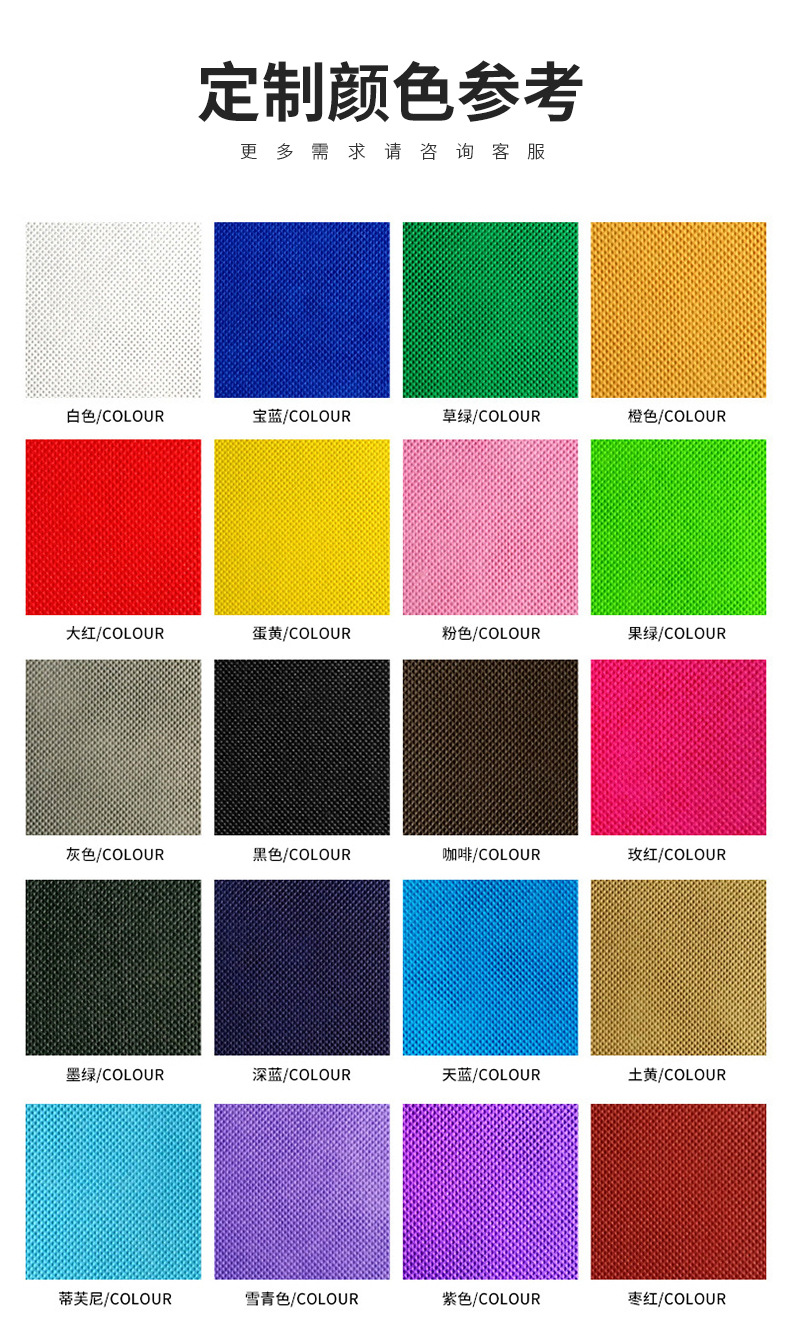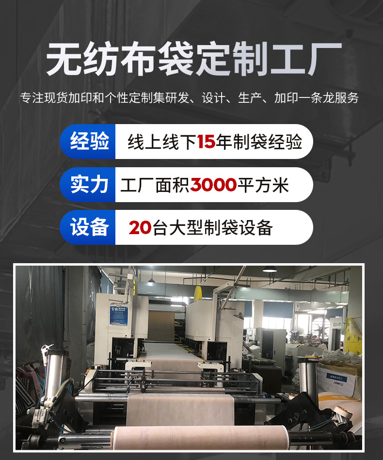 • 承接定制订单,涵盖的业务有无纺布袋,帆布袋,棉布袋,背心袋,编织袋,西装袋,外卖袋,平口袋,210D束口袋,保温袋等 可以按客人要求生产多种材质,及定制LOGO 联系电话;彭 15005891805