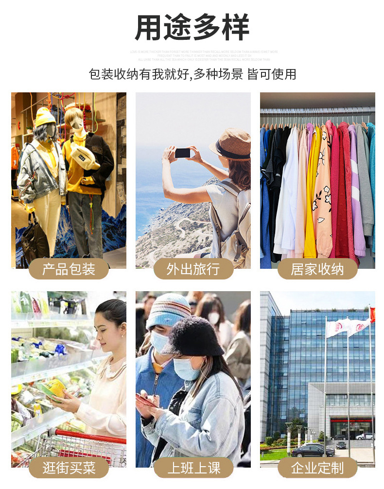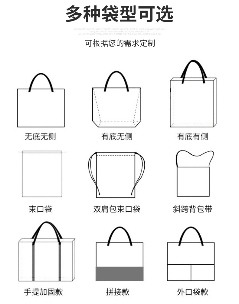 • 承接定制订单,涵盖的业务有无纺布袋,帆布袋,棉布袋,背心袋,编织袋,西装袋,外卖袋,平口袋,210D束口袋,保温袋等 可以按客人要求生产多种材质,及定制LOGO 联系电话;彭 15005891805