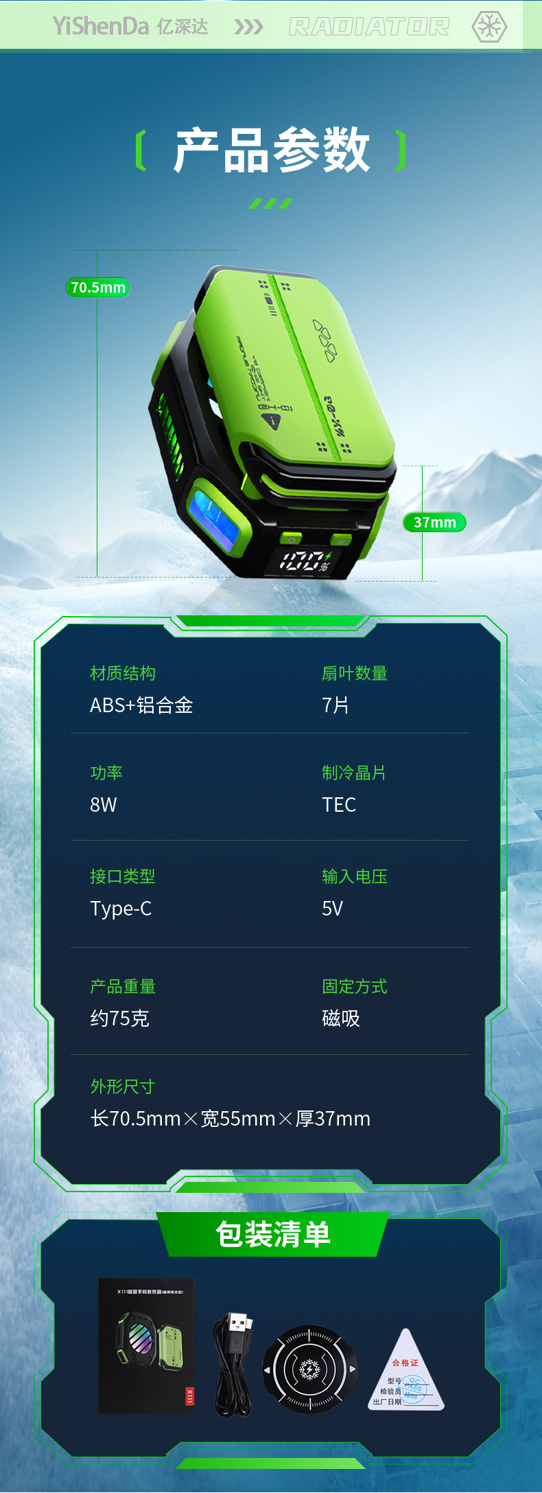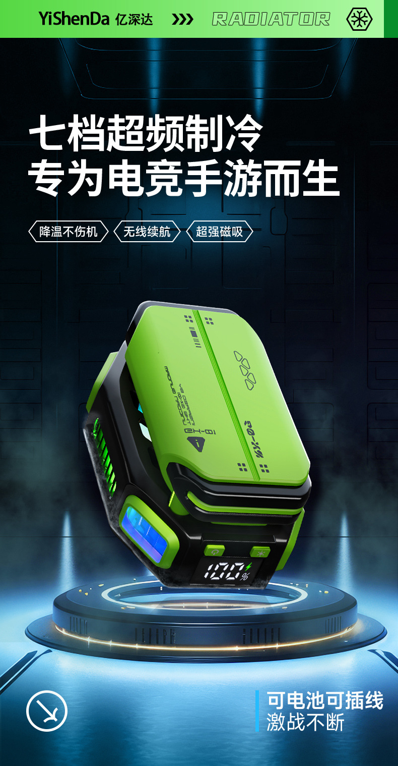 品牌: OEM 型号: X111 货号: YSD-X111 重量: 184g 功率: 10W 材质: ABS+合金+制冷片 接口: TYPE-C接口 有可授权的自有品牌: 否 是否专利货源: 否 屏幕: 带电量、档位显示 重量: 1.0 kg/个 装箱信息:长宽高:10X10X10cm 装箱重量: 1KG 装箱数量:5pcs