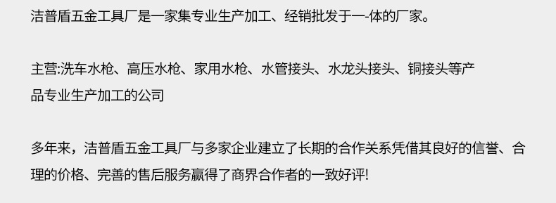 品牌: 其他 水枪尺寸: 158 接头材质: pp 喷射距离: 咨询客服 单枪重量: 30 枪头材质: pp 适用范围: 家用洗车等 把手材质: pp 水管材质: pp 水压: 咨询客服 重量: 0.5 kg/个 装箱信息:长宽高:10X10X10cm 装箱重量: 1KG 装箱数量:5pcs