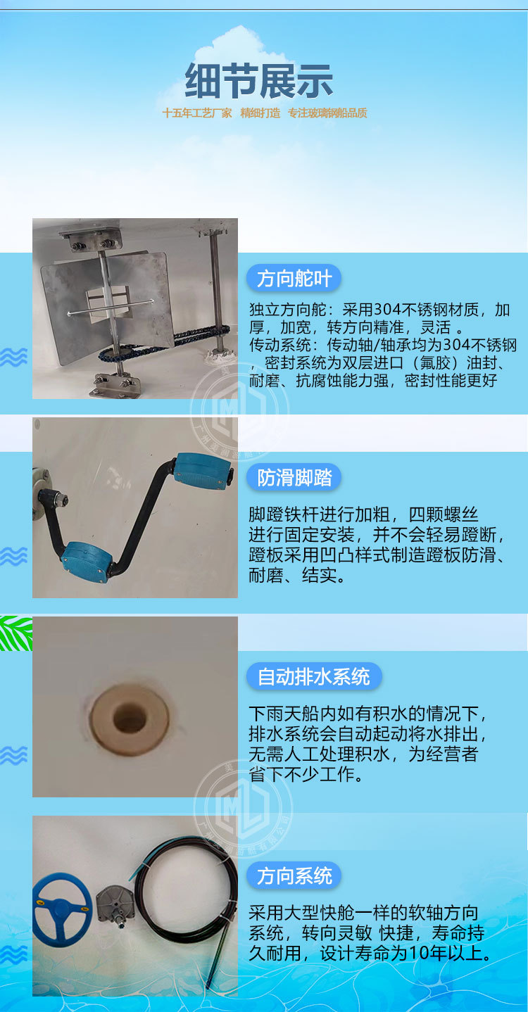 产品类别: 脚踏船 货号: M-075 品牌: 美澜 型号: M-075 船身材质: 玻璃钢 气泵: 无 划桨: 无 最大乘员数: 5 最大载重量: 600 是否跨境出口专供货源: 否 重量: 0.5 kg/件 装箱信息:长宽高:10X10X10cm 装箱重量: 1KG 装箱数量:5pcs