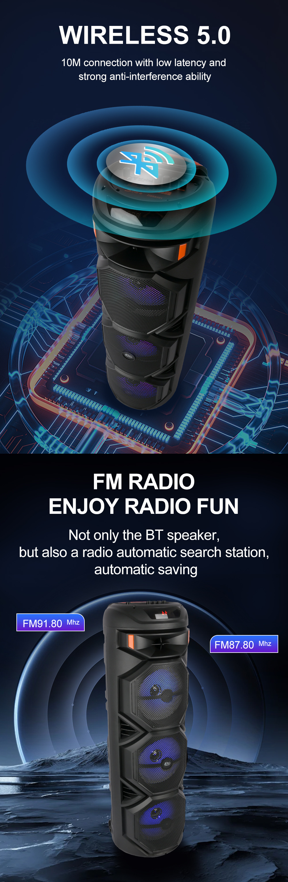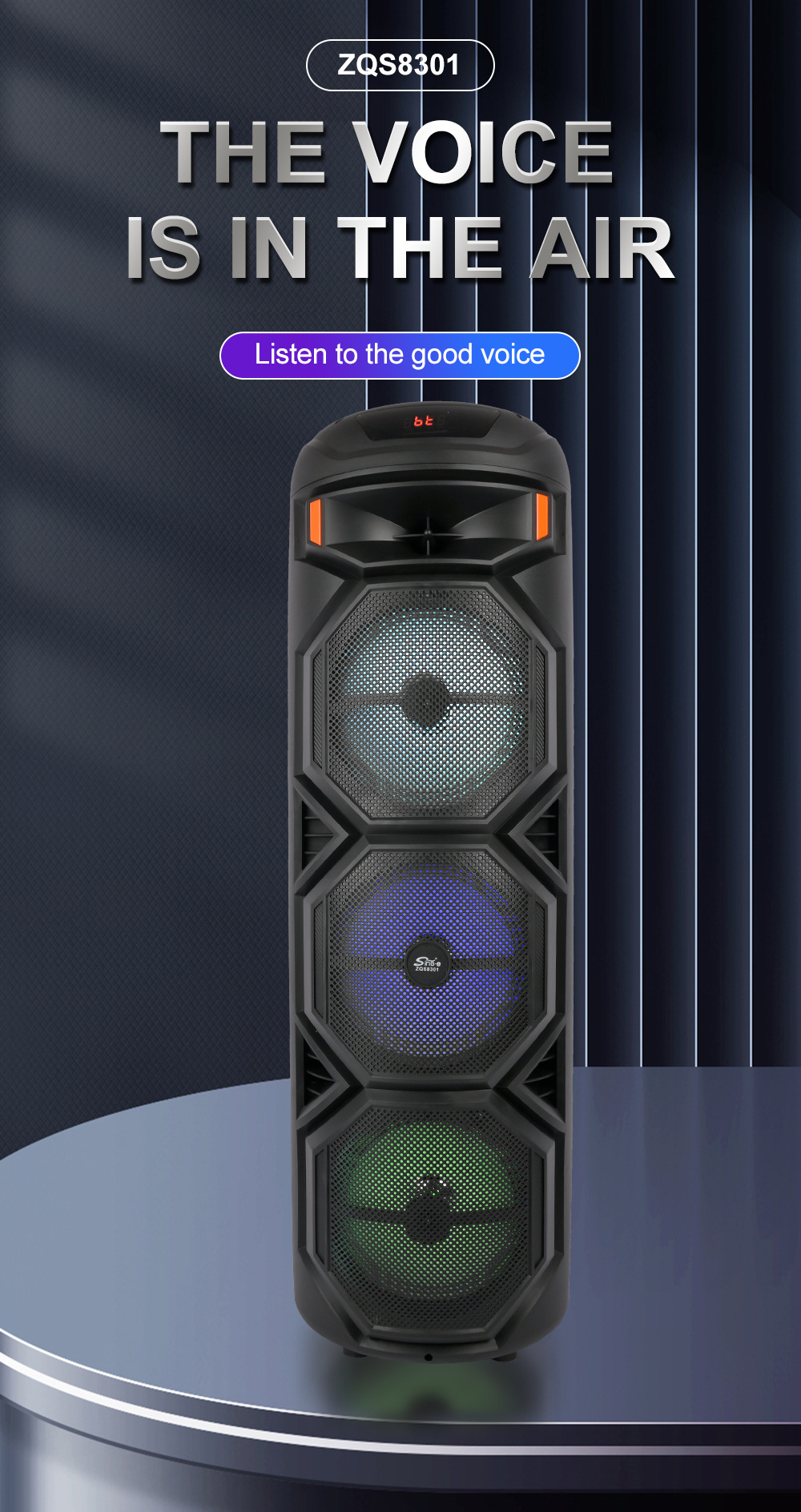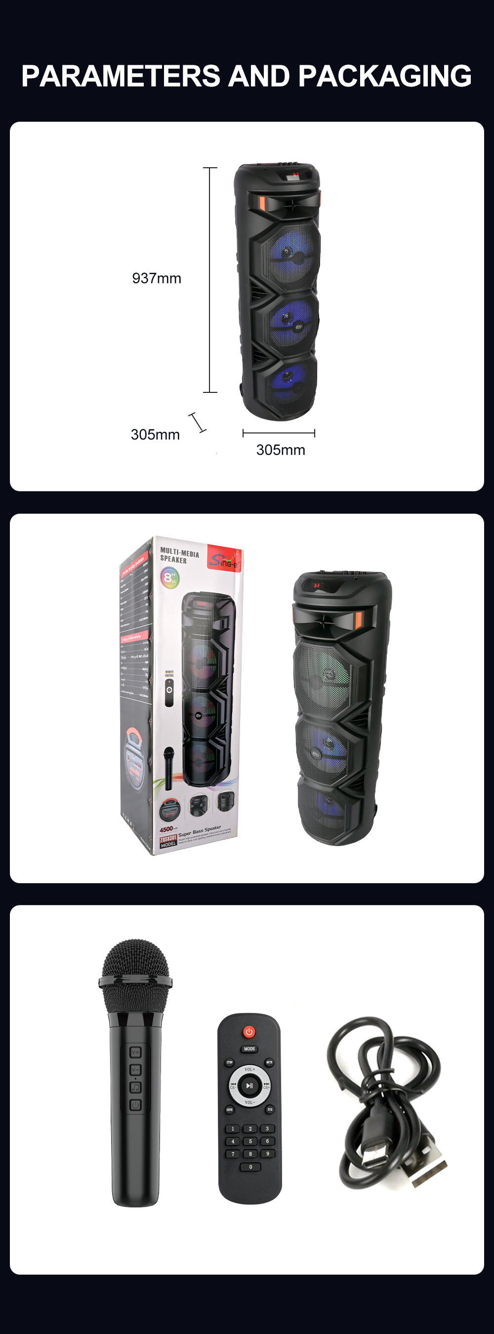 品牌: SING-E 适用场景: 其他 上市时间: 2024 连接方式: 蓝牙连接 频响范围: 60Hz-15KHz 信噪比: ≥85dB 喇叭数: 3 有效距离: 15M 箱体材质: 塑料 外观尺寸: 305x305x937mm 重量: 0.5 kg/件 装箱信息:长宽高:10X10X10cm 装箱重量: 1KG 装箱数量:5pcs