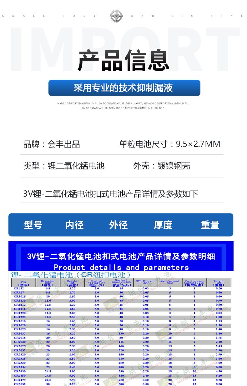 品牌: 会丰电池 产品认证: MSDS 是否进口: 非进口 重量: 0.5 kg/个 装箱信息:长宽高:10X10X10cm 装箱重量: 1KG 装箱数量:5pcs