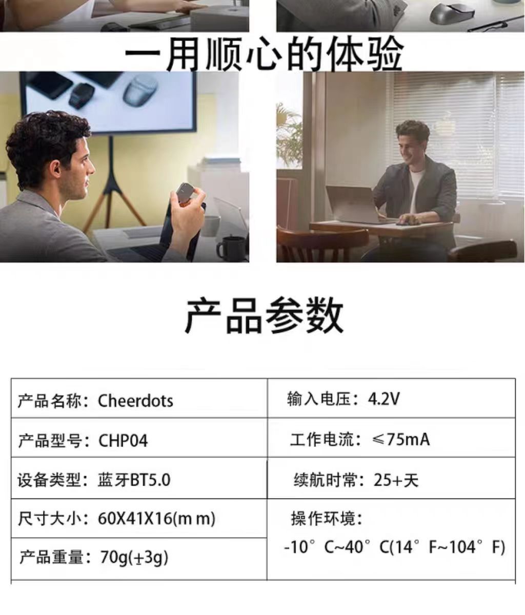 产品尺寸是:60*40*16mm,产品重量是70克,产品包装尺寸是:10.8*6.8*3.5 cm。电池容量是450mah,输入电压是4.2V.蓝牙版本是:BT5.0