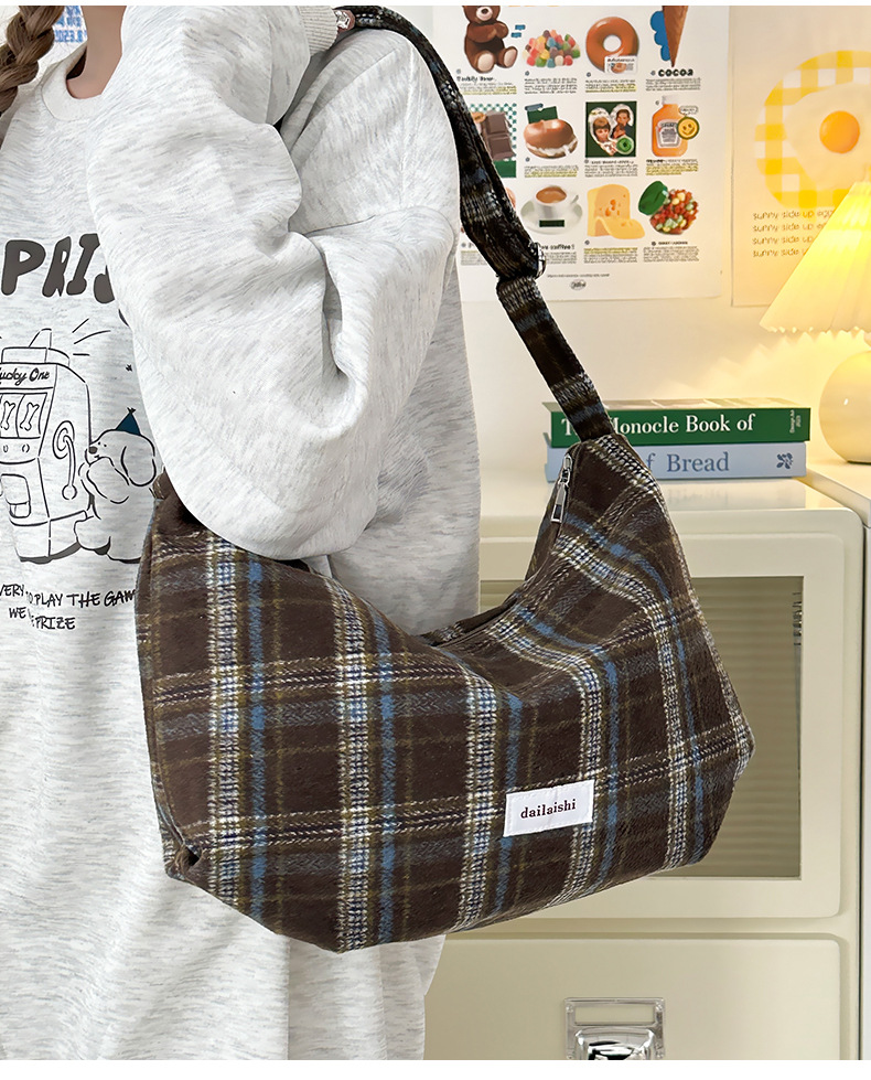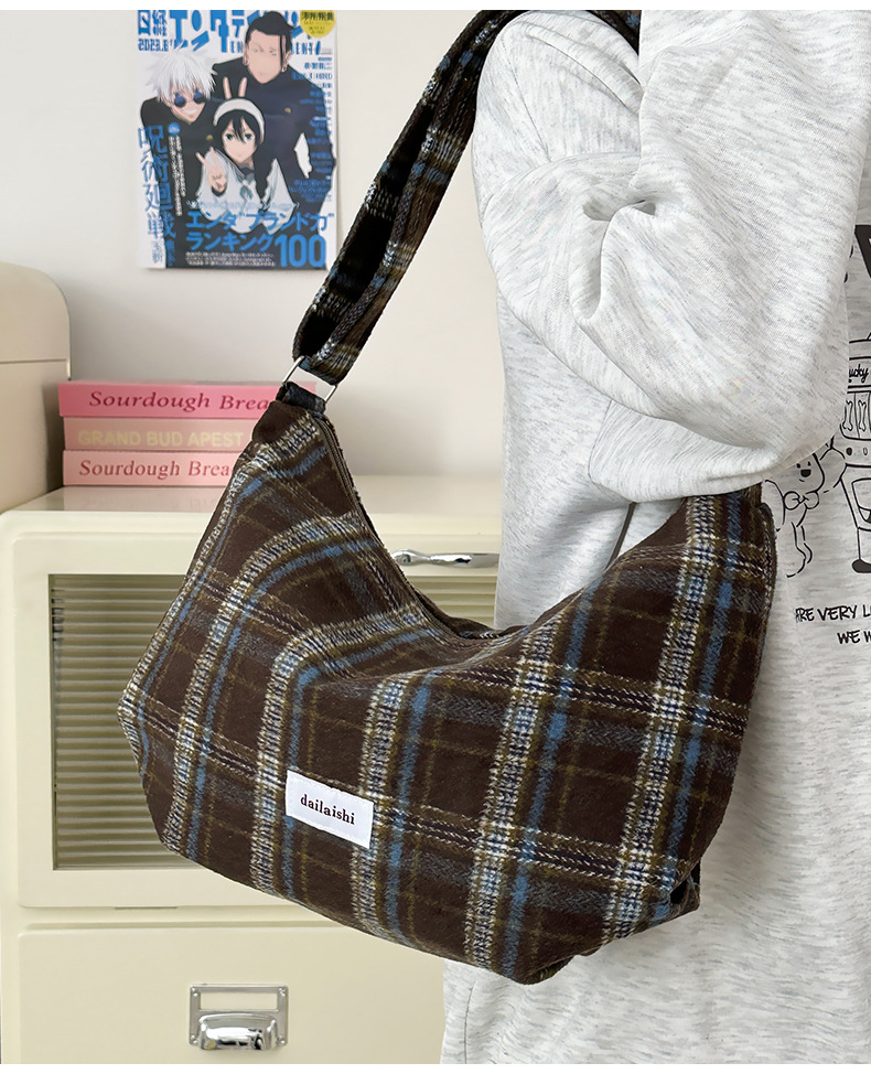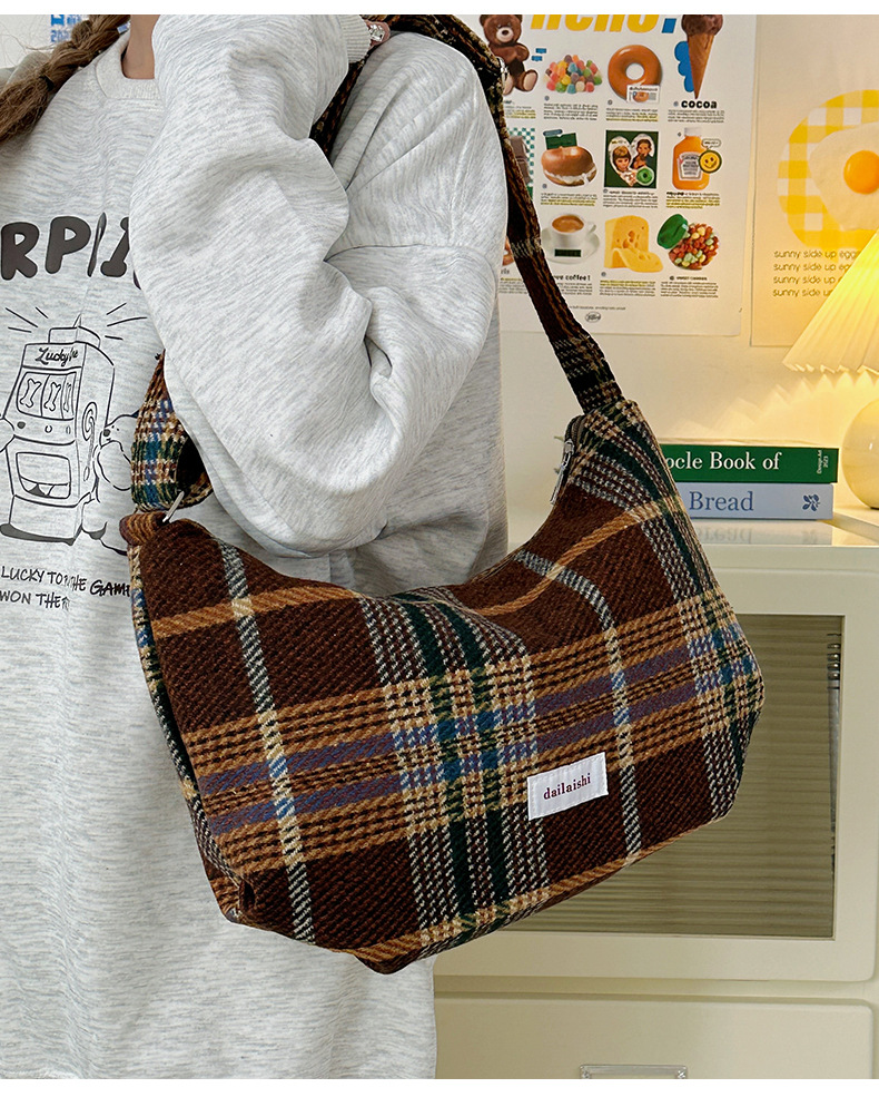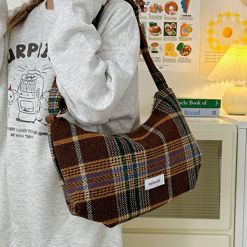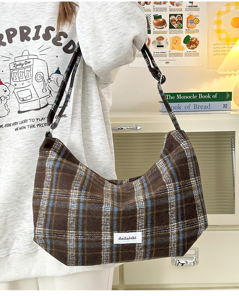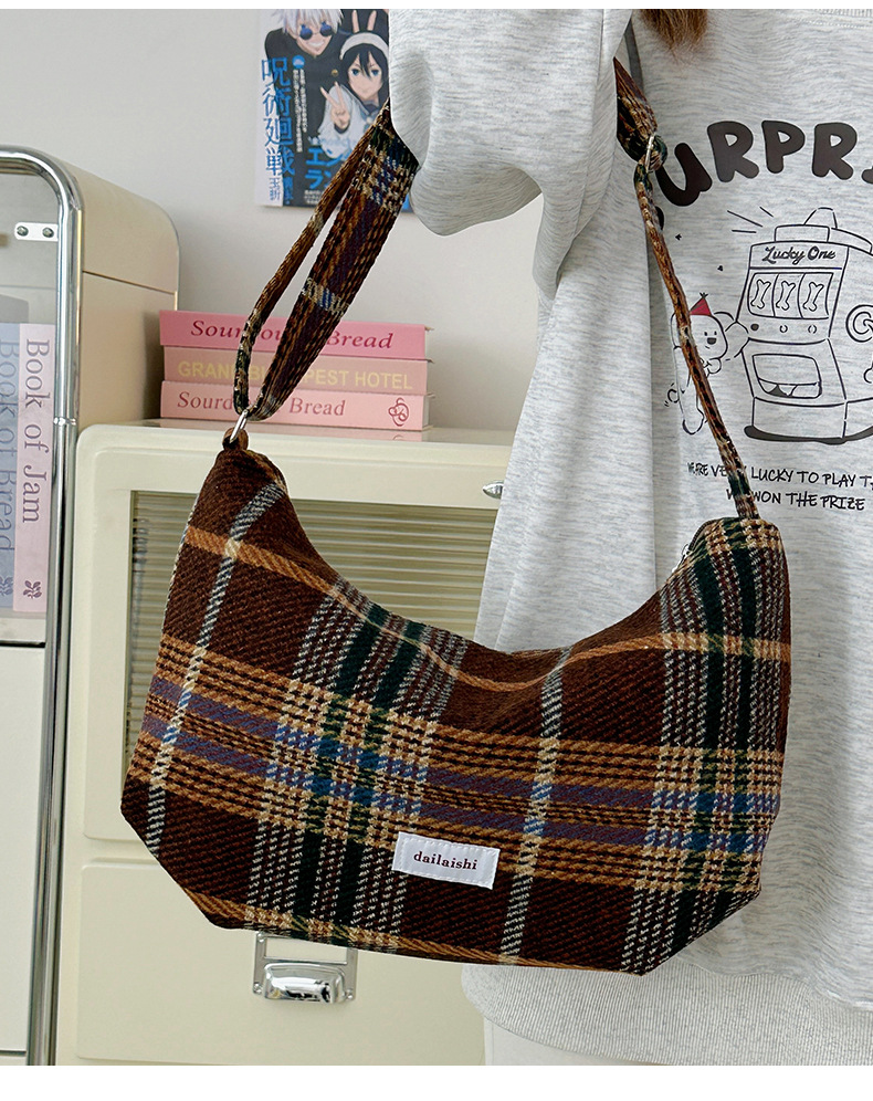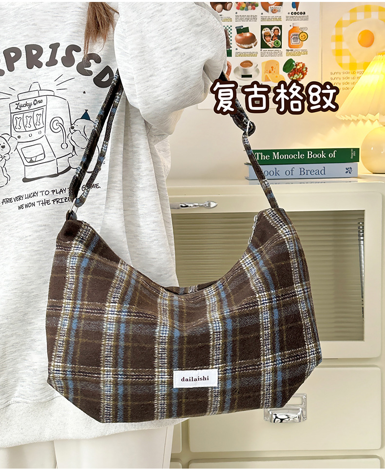 时尚韩版格子斜挎包个性百搭通勤饺子包大容量复古文艺学生单肩包 English | 投诉