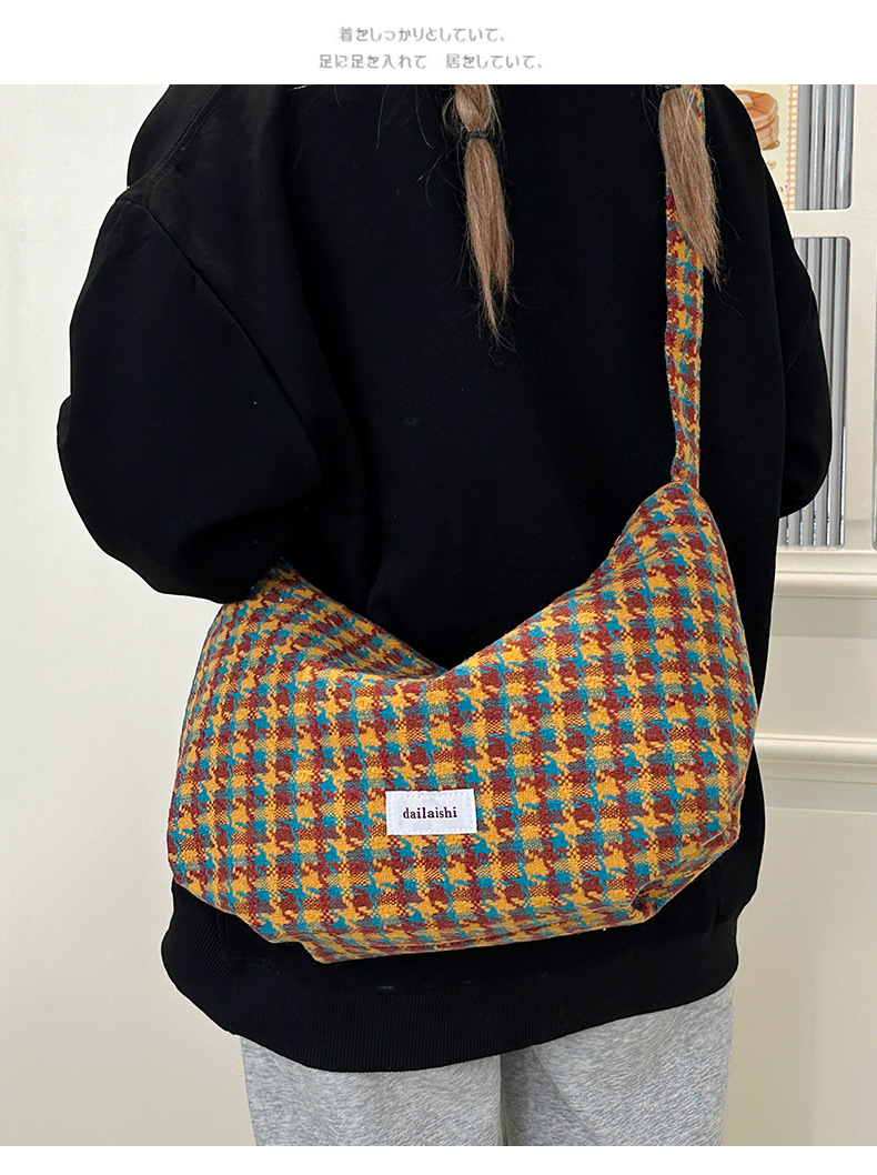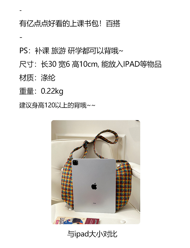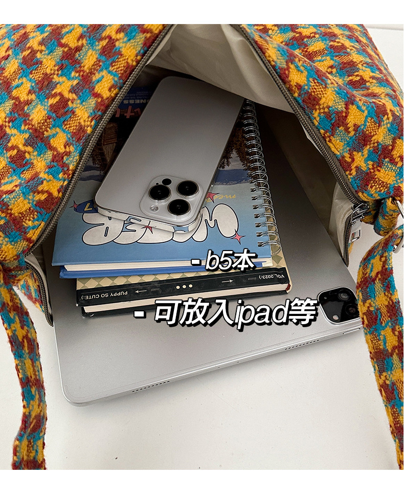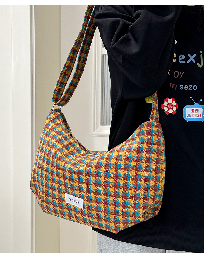 颜色: 橘色千鸟格,深咖蓝格,浅卡其,棕格 风格: 都市简约 货号: DML&245 材质: 涤纶 箱包潮流款式: 饺子包 箱包大小: 大 流行元素: 车缝线,格纹 上市年份季节: 2025年春季 里料质地: 涤纶 箱包形状: 其他