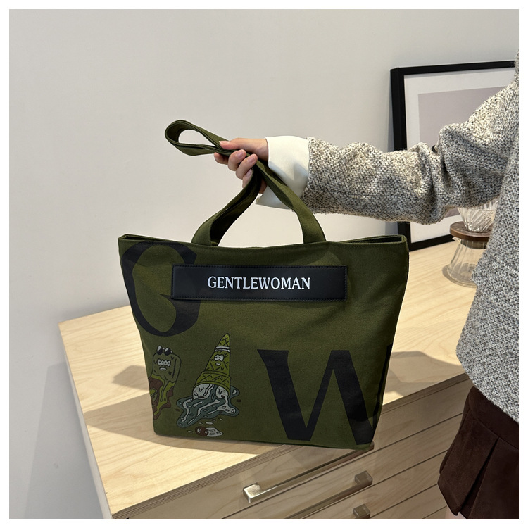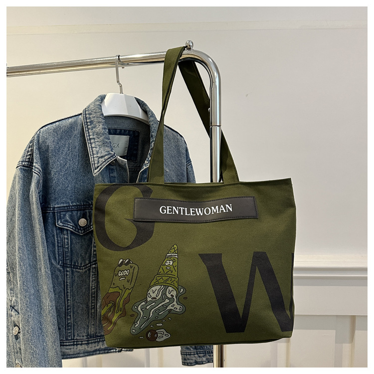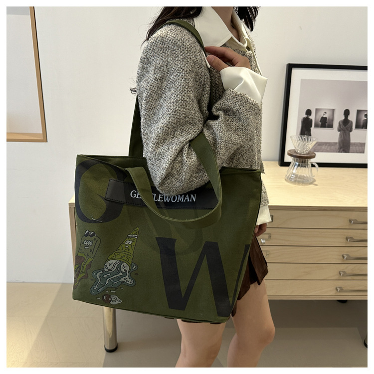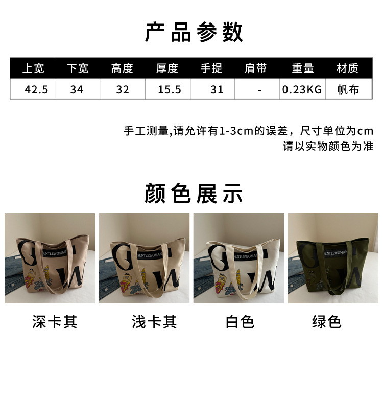颜色: 深卡其色,浅卡其色,白色,绿色 风格: 都市简约 货号: ZHz&044 材质: 帆布 箱包潮流款式: 托特包 箱包大小: 大 流行元素: 字母 上市年份季节: 2024年秋季 里料质地: 涤纶 箱包形状: 横款方型