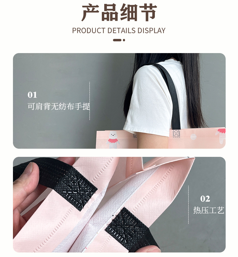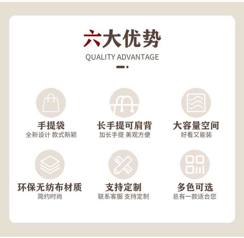 材质: 无纺布覆膜 定制: 定制客户logo 用途: 通用 印刷工艺: 丝印 风格: 简约 手感: 耐磨 重量: 0.02 kg/个 装箱信息:长宽高:50X55X60cm 装箱重量: 30KG 装箱数量:1500pcs