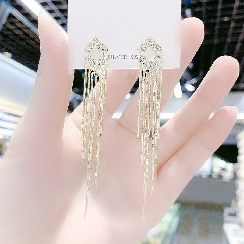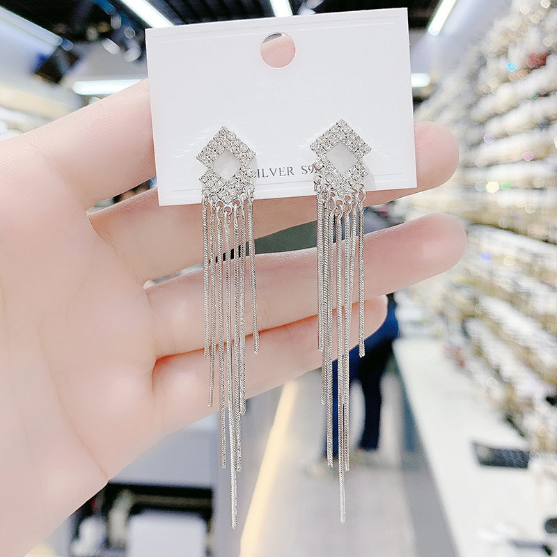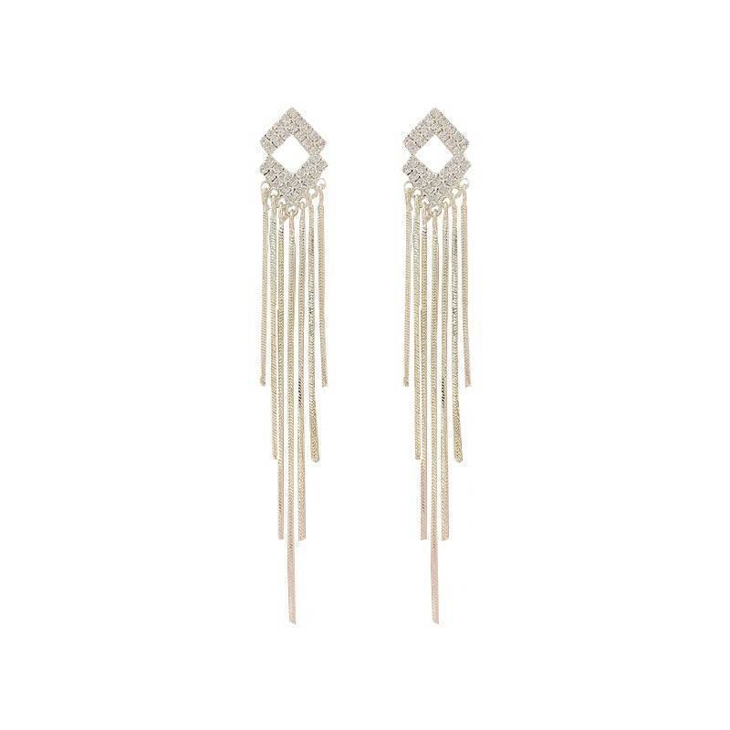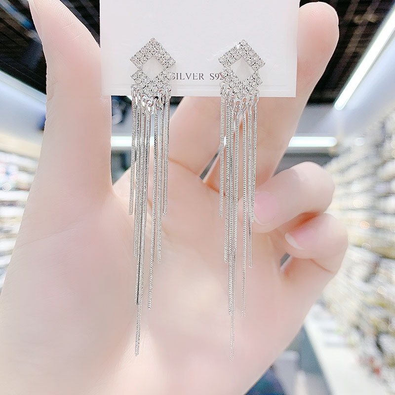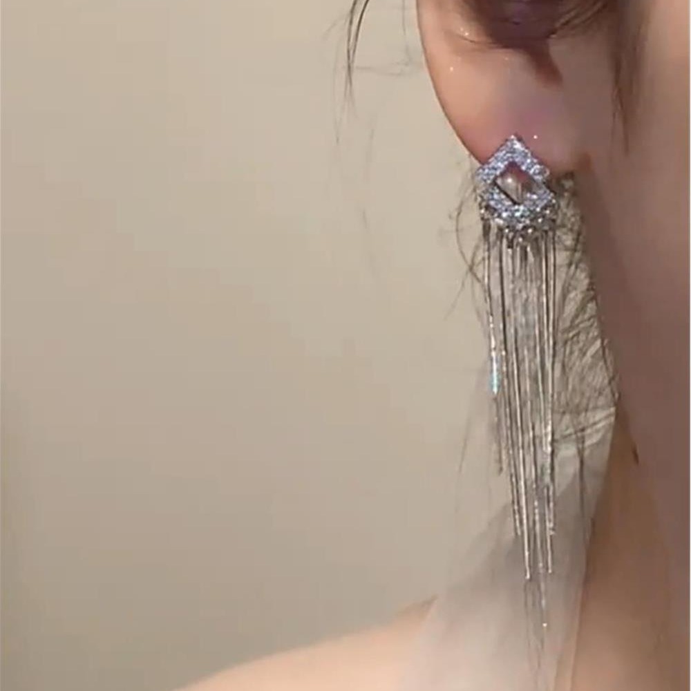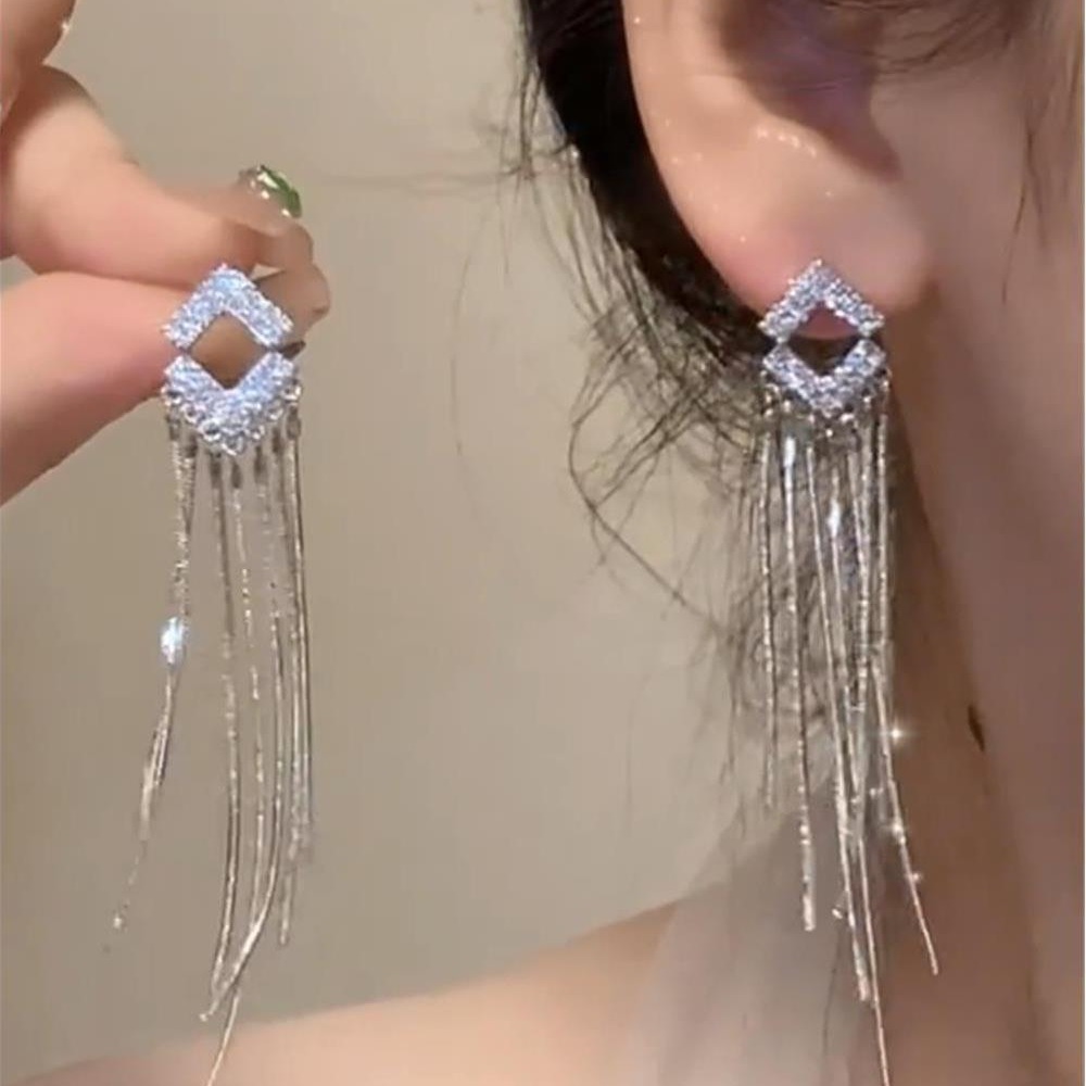 2024年新款潮韩国时尚耳钉气质镶钻菱形流苏耳环长款网红耳饰品 English | 投诉