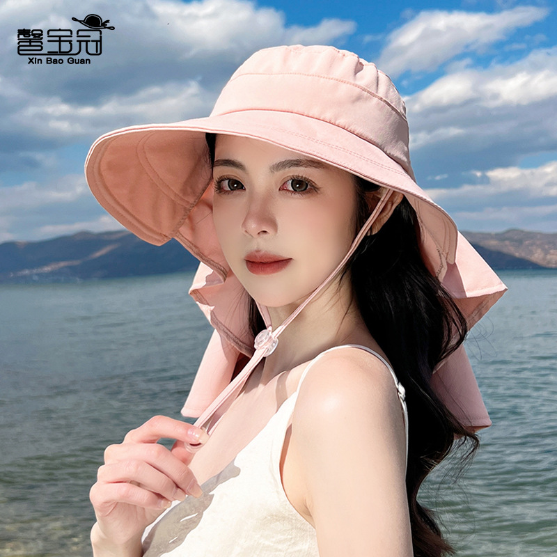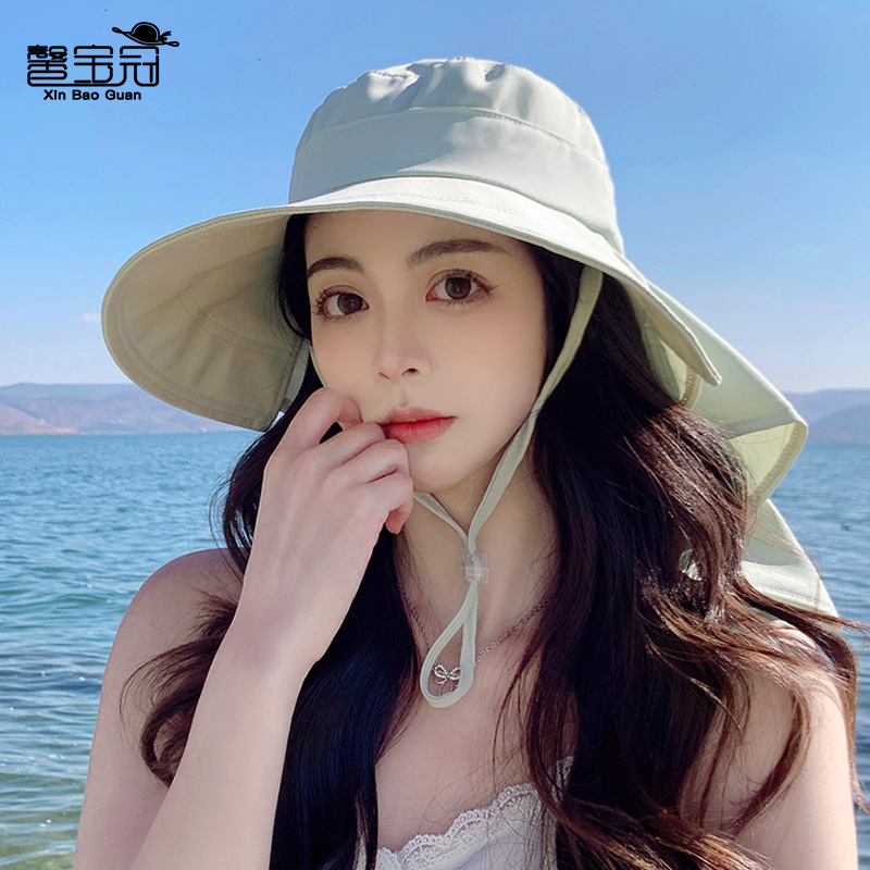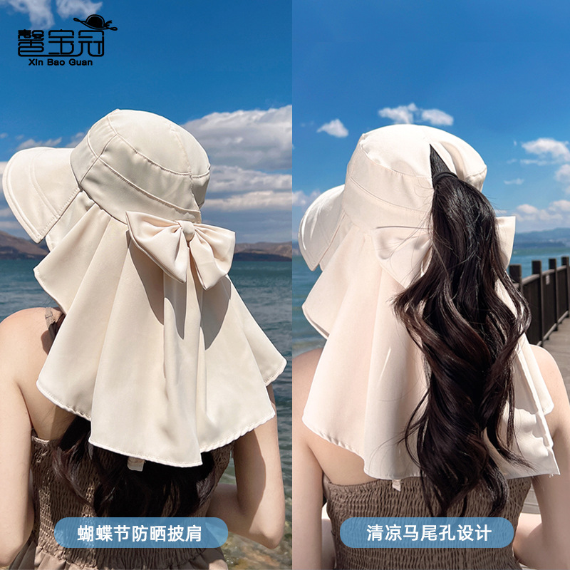 8459春夏季户外防晒遮阳帽大檐披肩渔夫帽韩版时尚带马尾孔帽子女