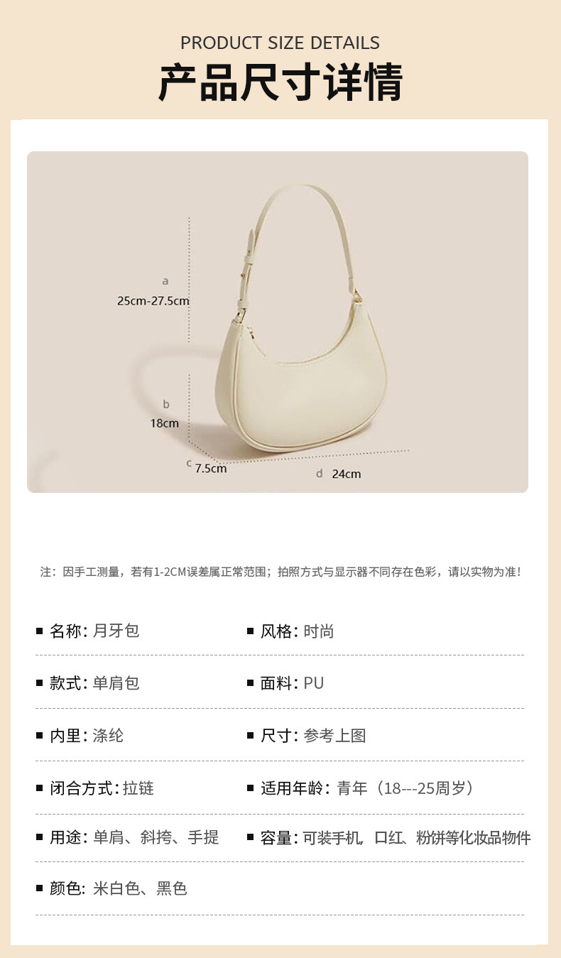 颜色: 米白色,黑色 风格: 都市简约 材质: PU 箱包大小: 中 上市年份季节: 2025年春季 适用场景: 日常搭配 品牌: 淇珵 流行元素: 车缝线 里料质地: 涤纶 箱包形状: 水饺型 重量: 0.2 kg/件