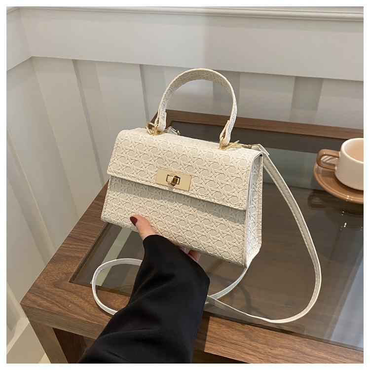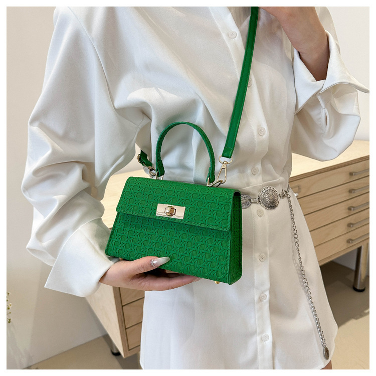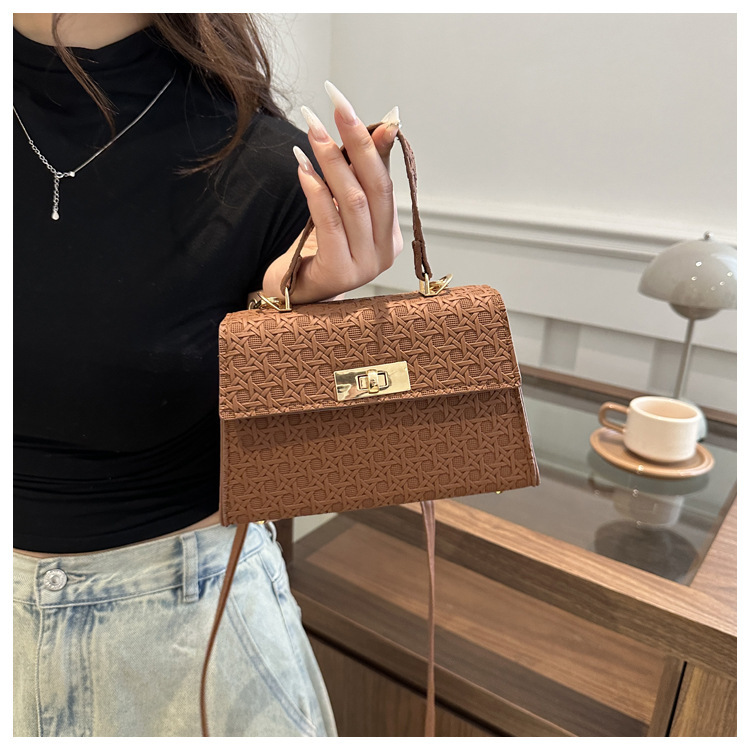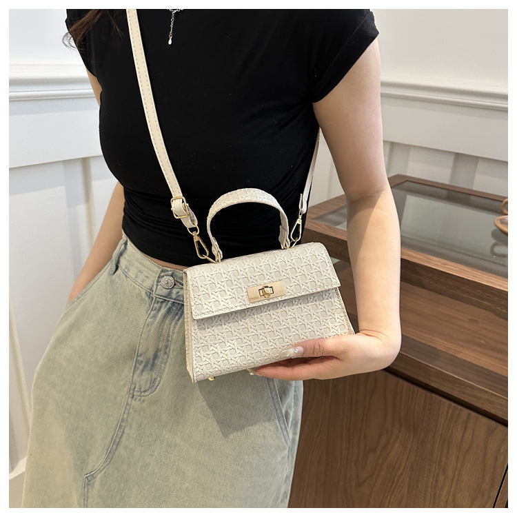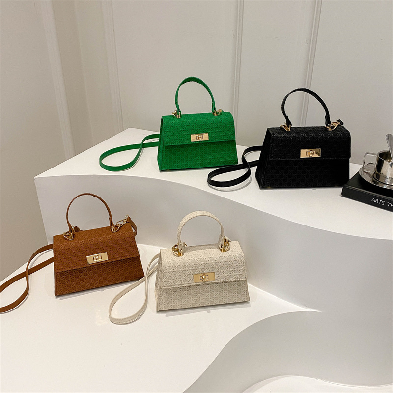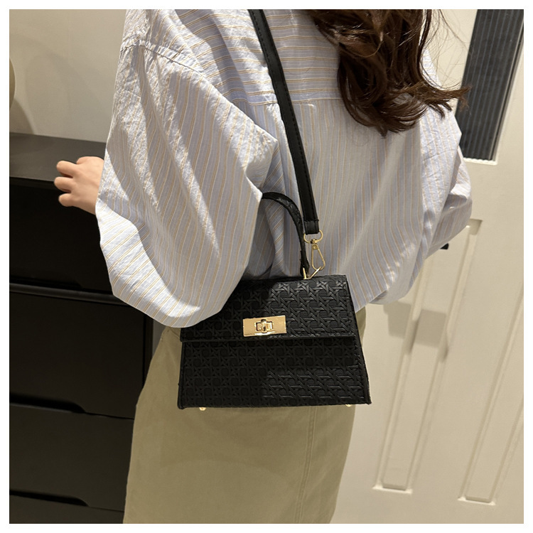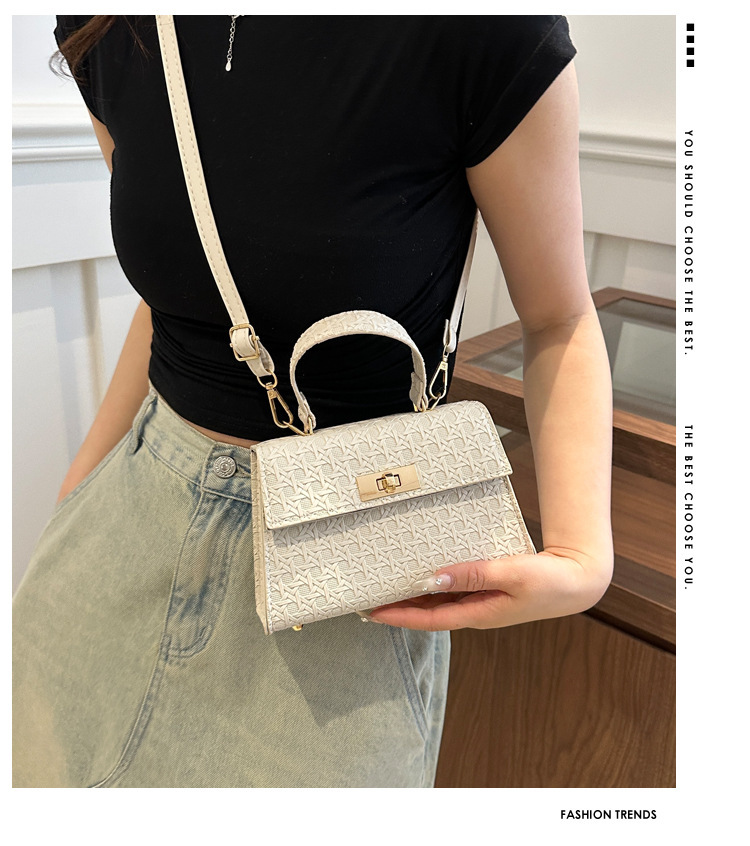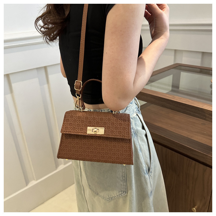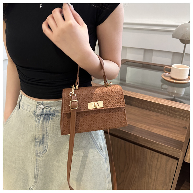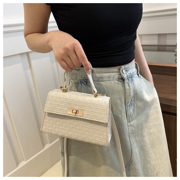时尚压花手提包包女2024夏季新款小方包洋气纯色转锁单肩斜挎包