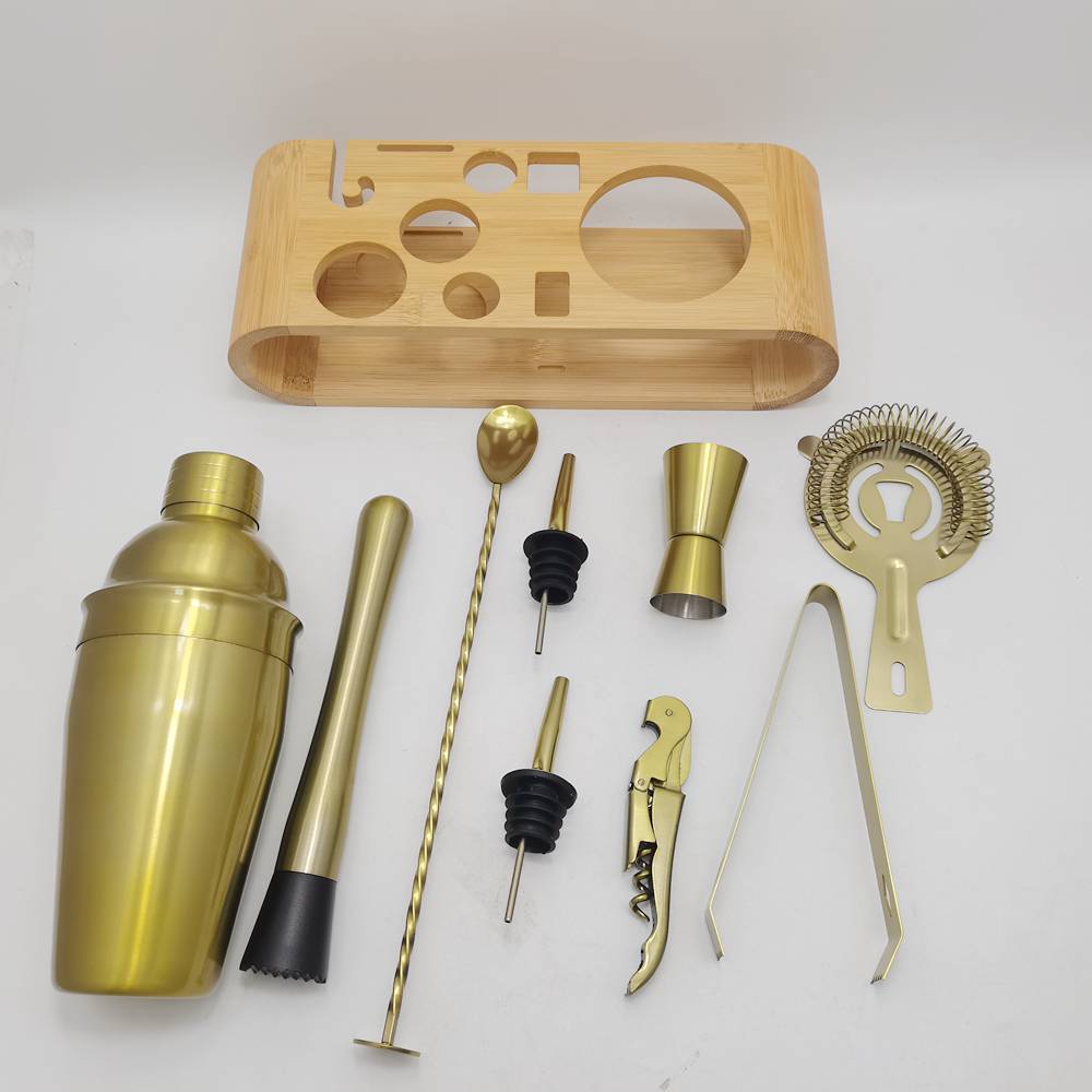 现货10件套不锈钢调酒器套装酒吧工具带竹架雪克师杯鸡尾酒调酒器